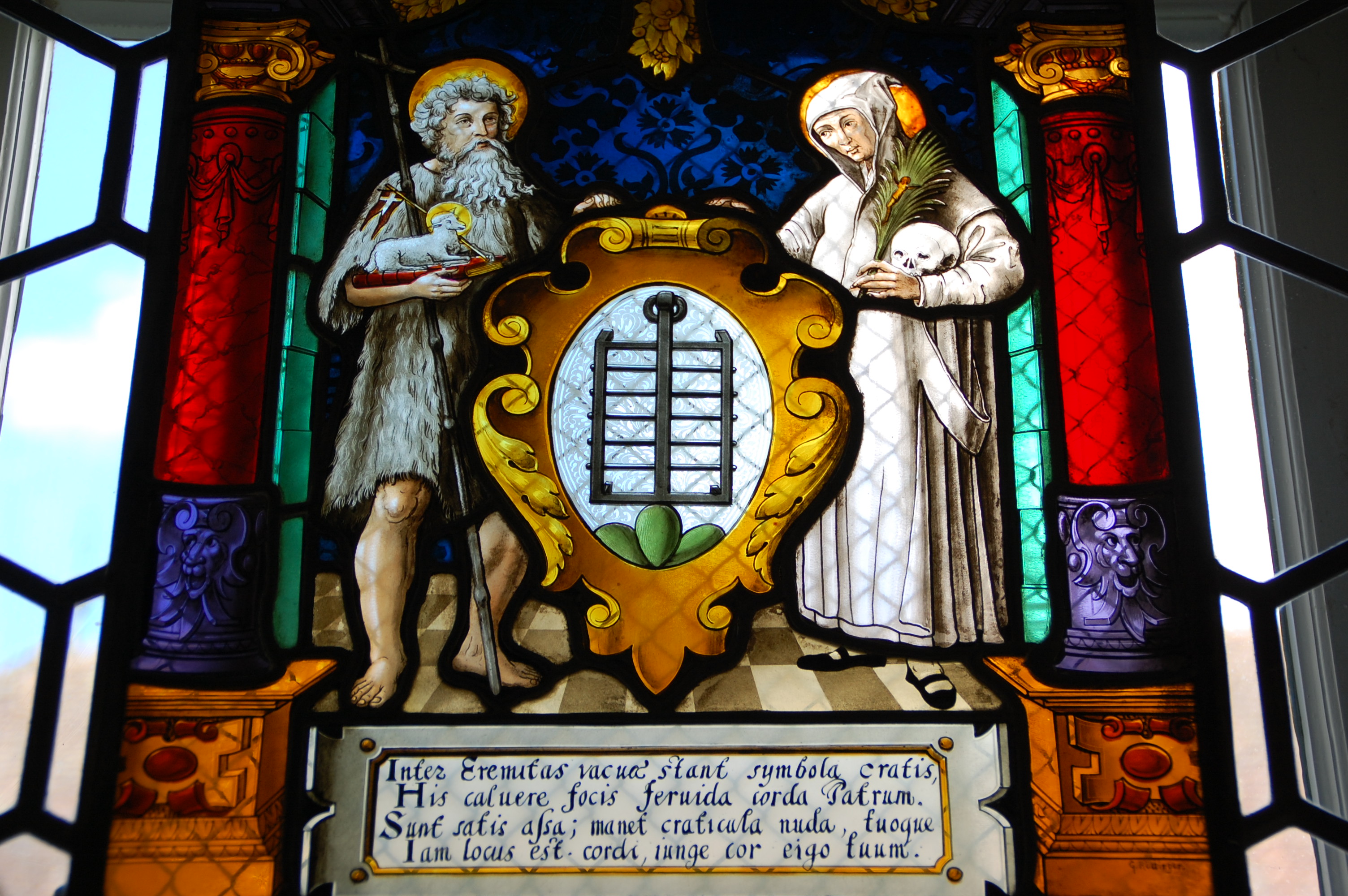 Johannes der Täufer mit dem Lamm auf einer Wappenscheibe, die im Kreuzgang hängt. Rechts der heilige Bruno, der Ordensgründer der Kartäuser, in der Mitte das Wappen des heiligen Laurentius, des Ittinger Kirchenpatrons. Er wurde auf einem Rost zu Tode gefoltert. Bild: kaz.