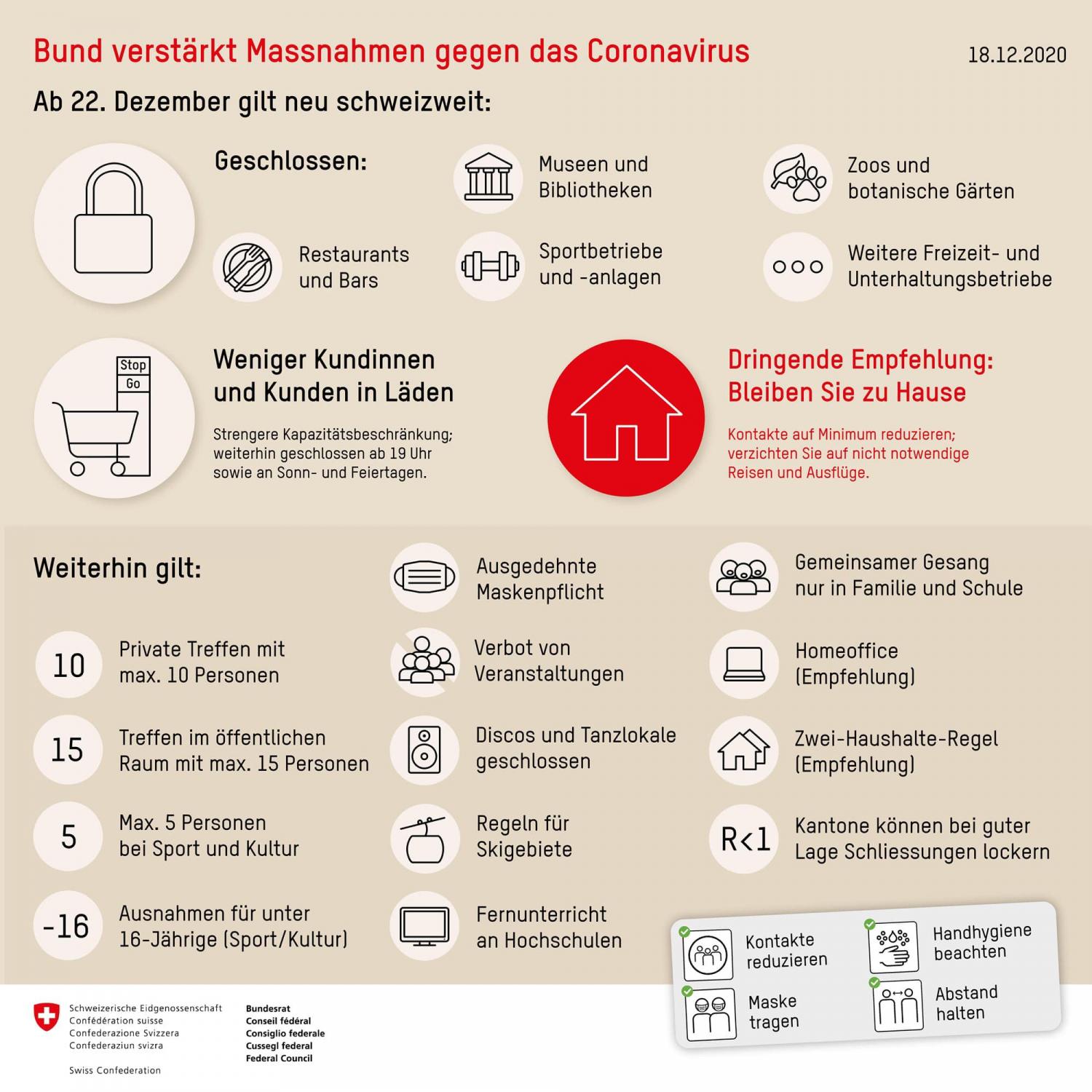 Neben den Kulturhäusern müssen nach den neuen Vorgaben auch die Restaurants schliessen. Für die Festtage gibt es keine Ausnahmen. Offen bleiben dürfen nur Betriebskantinen, Schulkantinen sowie die Restauration für Hotelgäste. Takeaway-Angebote und Lieferdienste bleiben allerdings erlaubt.
