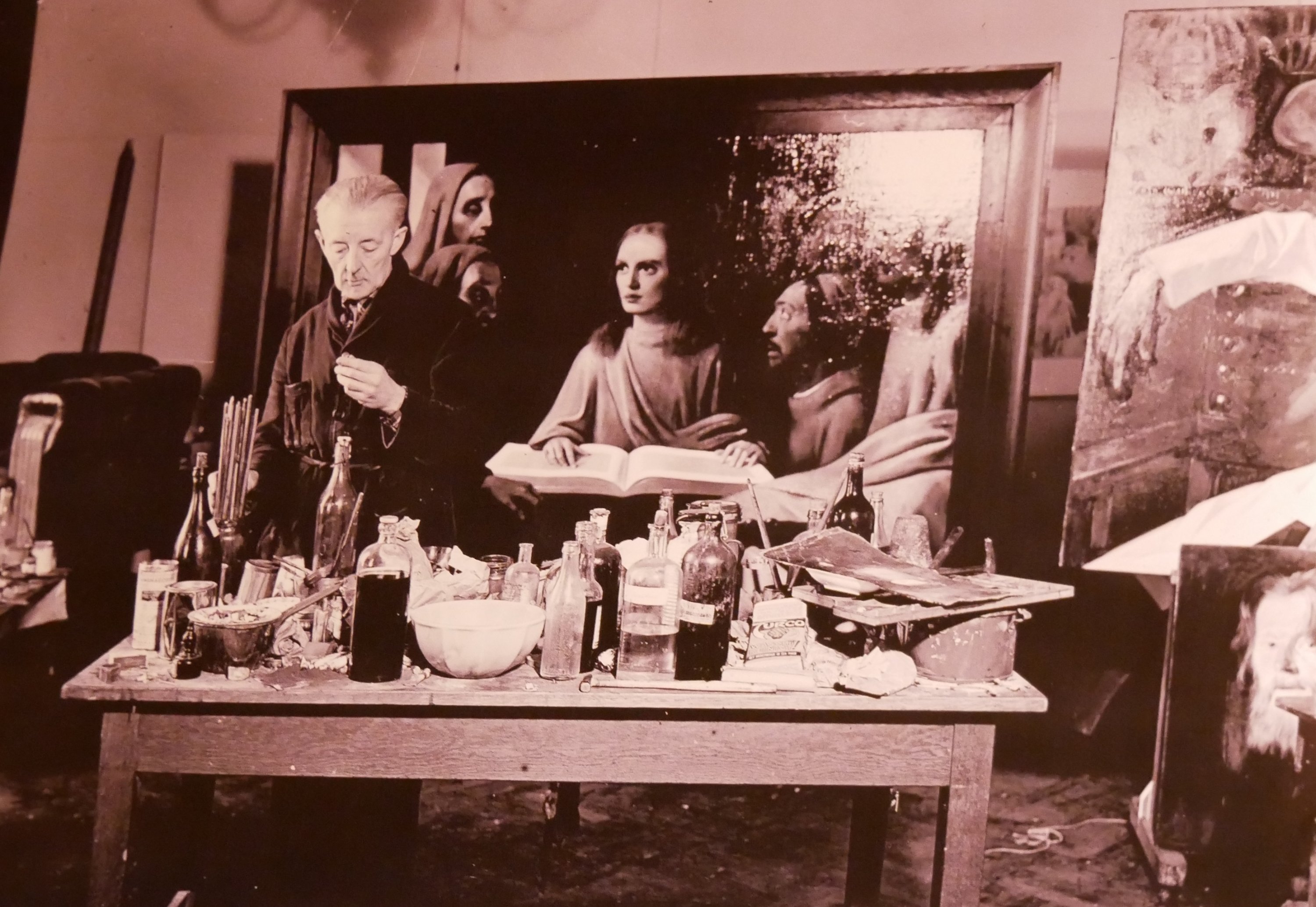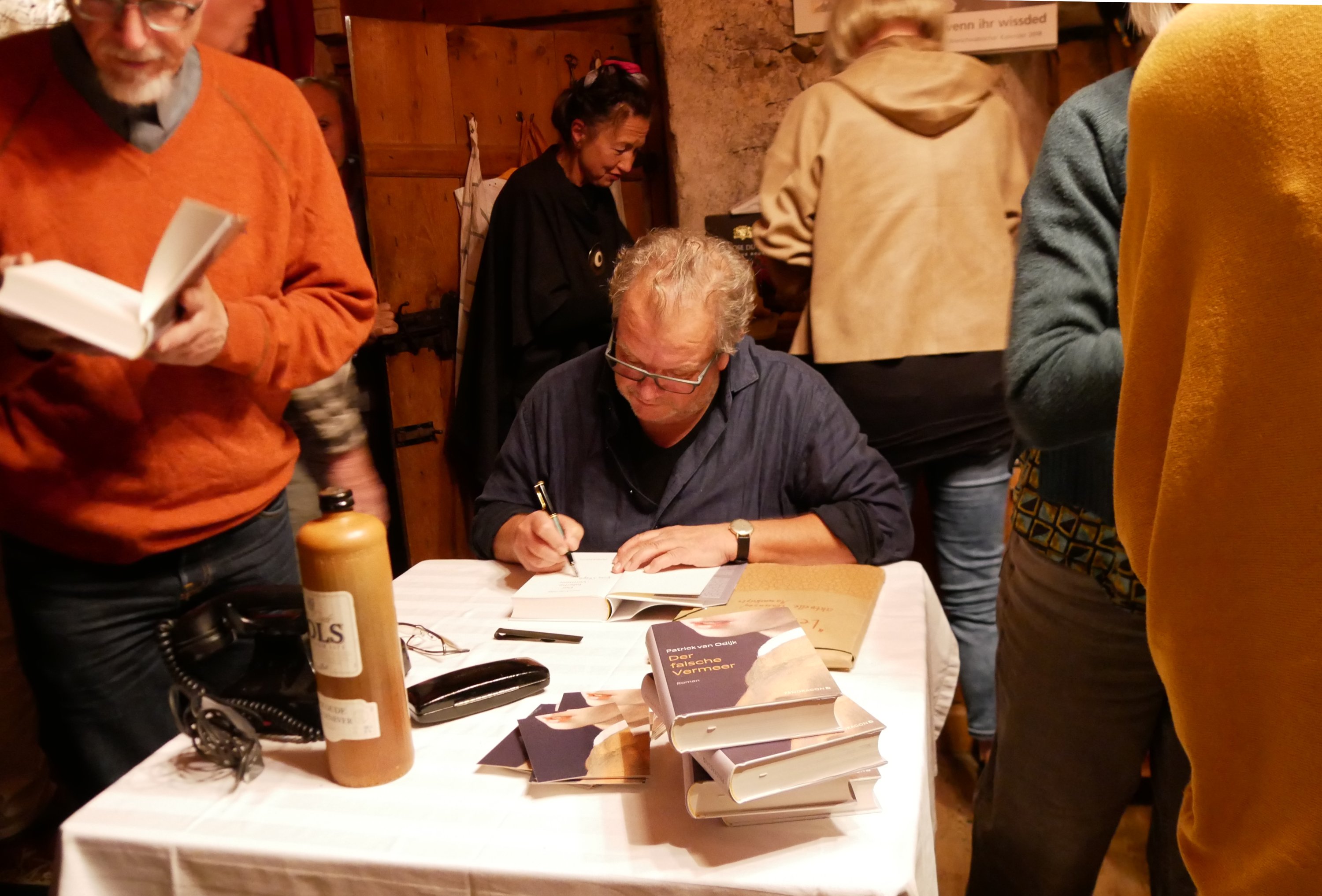 Unter anderem mischt er Bakelit – den damals neuen Kunststoff, aus dem etwa Telefone der 1940er-Jahre bestanden – unter die Pigmente. Passend dazu brachte van Odijk ein solches Bakelit-Telefon mit zur Lesung. Ebenso einen Genever, den niederländischen Wacholderschnaps, von dem sowohl der historische Van Meegeren als auch der fiktive van Aelst reichlich tranken.