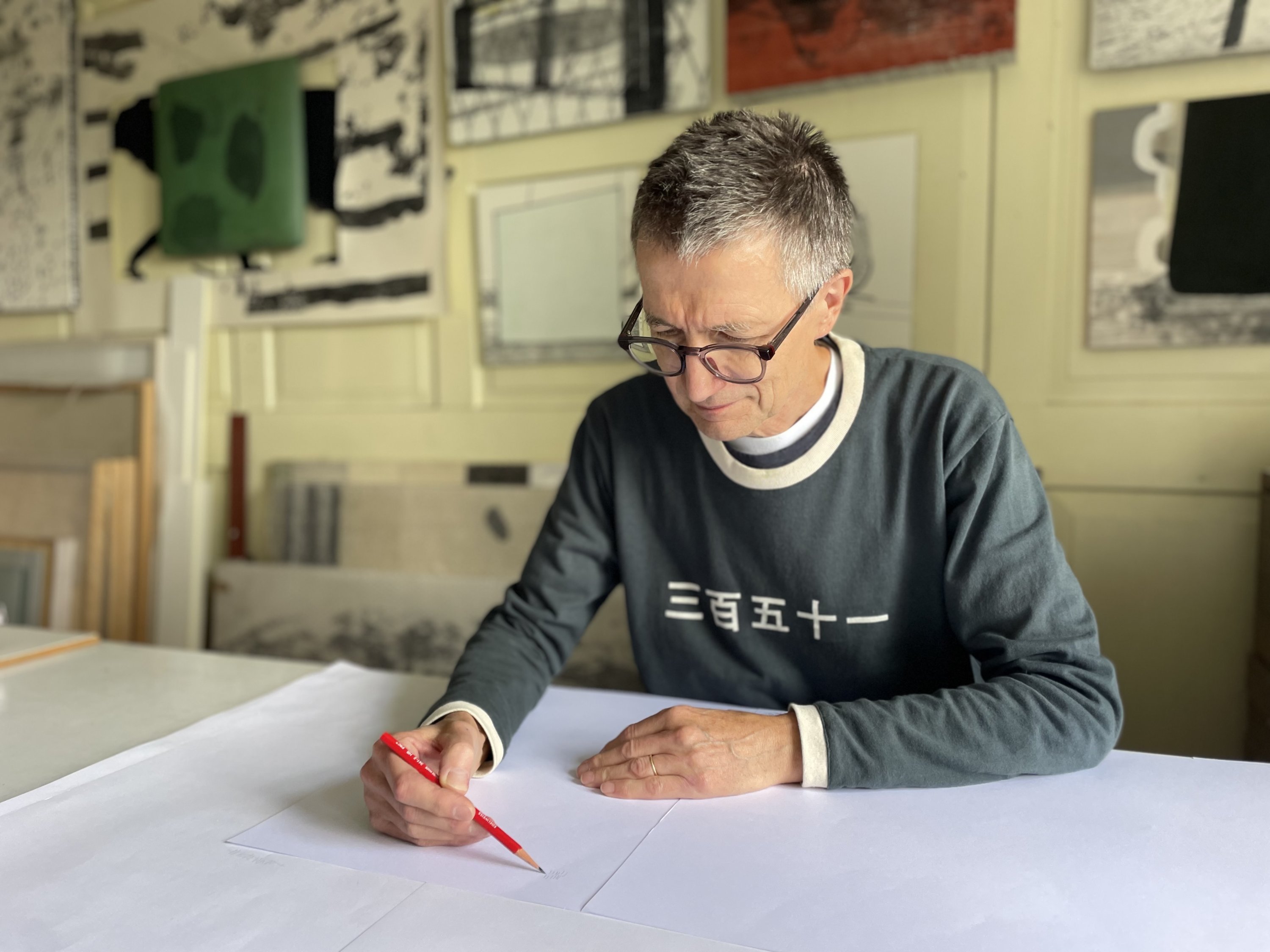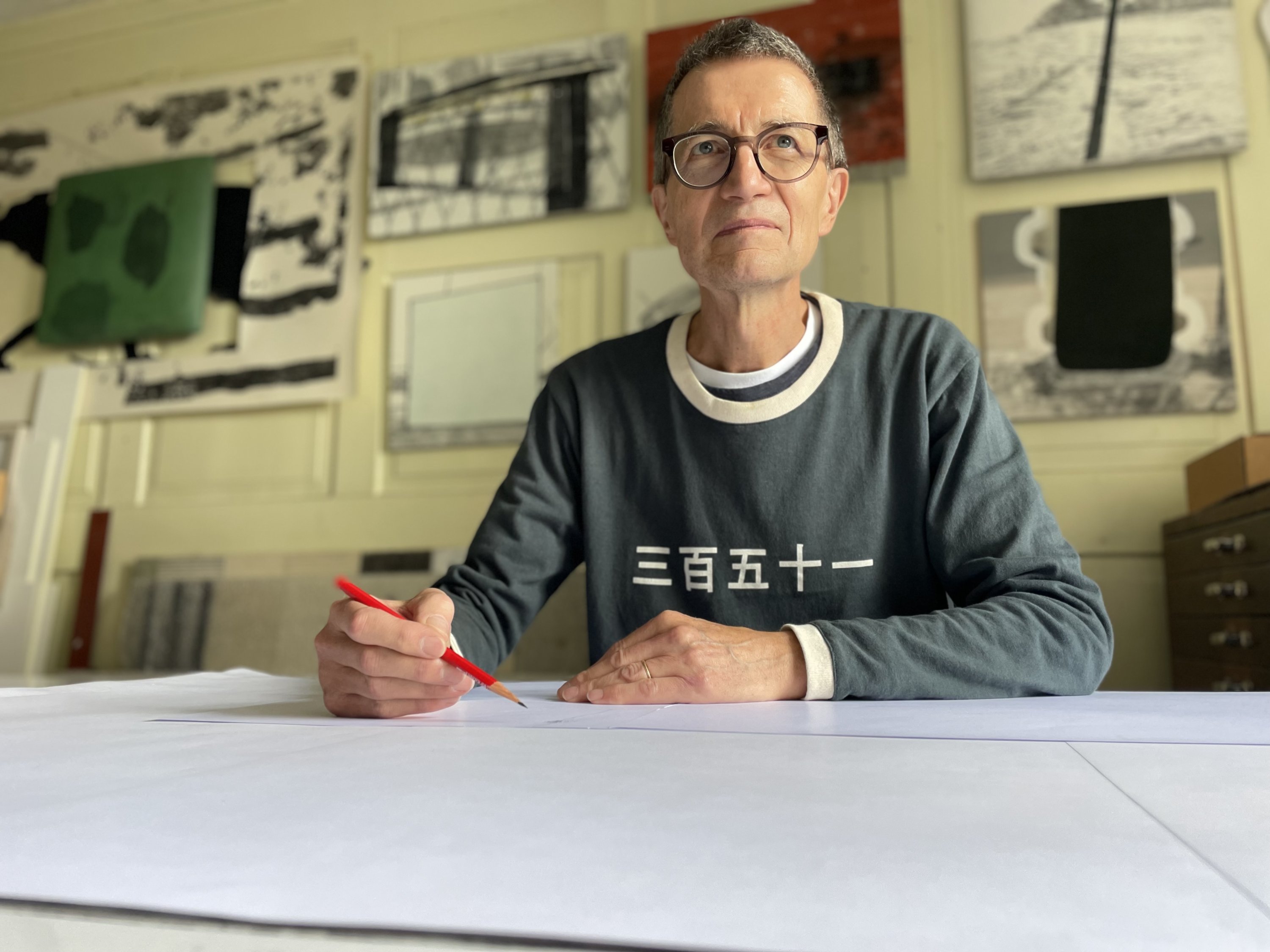 „Diese Momente des Anspitzens sind für mich essenziell“, sagt der Künstler. Aufstehen, den Blick heben, den Stift in die Hand nehmen, ihn mit einem superscharfen Messer in die gewünschte Form bringen – das ist für ihn ein wichtiger Teil des künstlerischen Prozesses. „In diesen Momenten kann ich mich sammeln und fokussieren“, sagt der 70-Jährige.