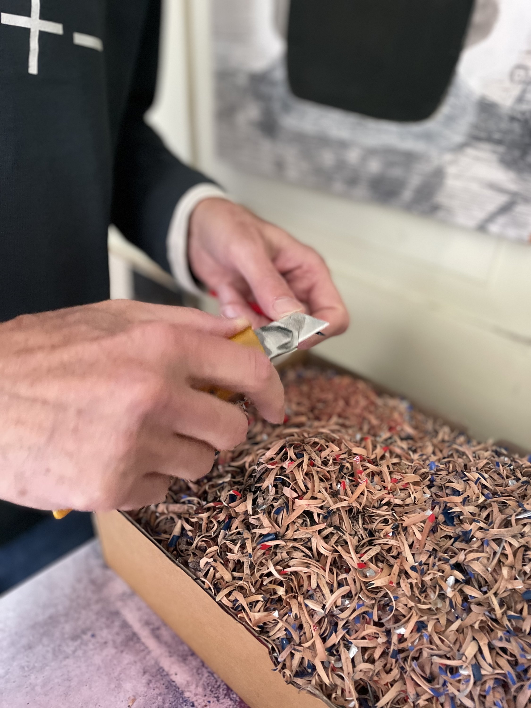 Sein Atelier hat er mittlerweile in sein Wohnhaus verlegt, der Arbeitsplatz ist aufgeräumt wie immer. Kugelschreiber, Bleistifte, Gummibänder, Pinsel, Schrauben stehen offen, aber separat gebündelt in Dosen und Schatullen an einem Beistelltisch zum eigentlichen Arbeitstisch. Darauf auch eine Schachtel mit einem Haufen Überresten gespitzter Bleistifte – fast schon selbst eine Skulptur, die die Spuren seiner Arbeit zeigt.
