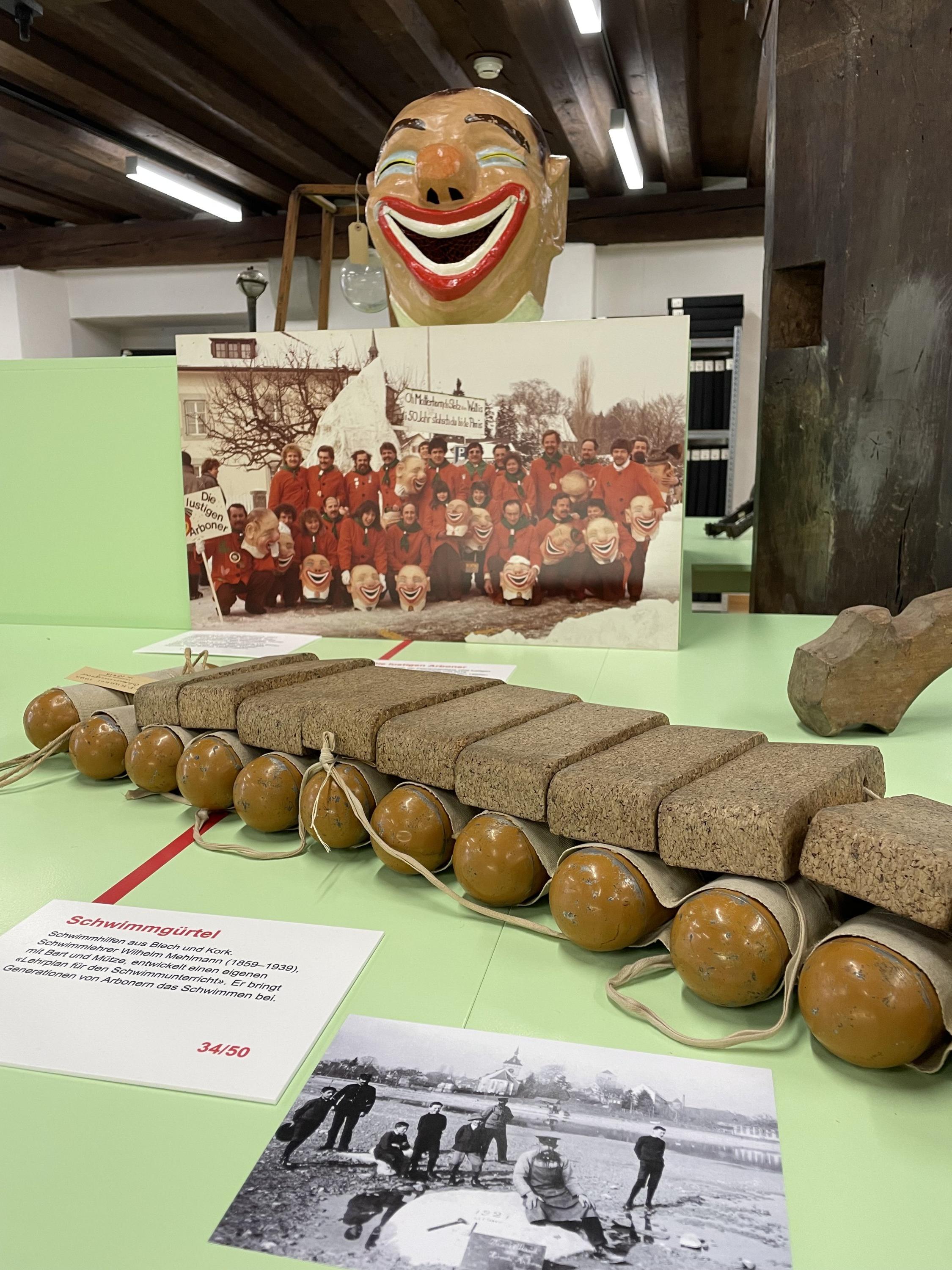 Zum Beispiel ein aus Kork und Blech gefertigter Schwimmgürtel mit dem der Schwimmlehrer Wilhelm Mehlmann (1859-1939) Generationen von Arboner:innen das Schwimmen beibrachte. Mehlmann hatte einen eigenen „Lehrplan für den Schwimmunterricht“ entworfen, der Gürtel war ein Teil davon.