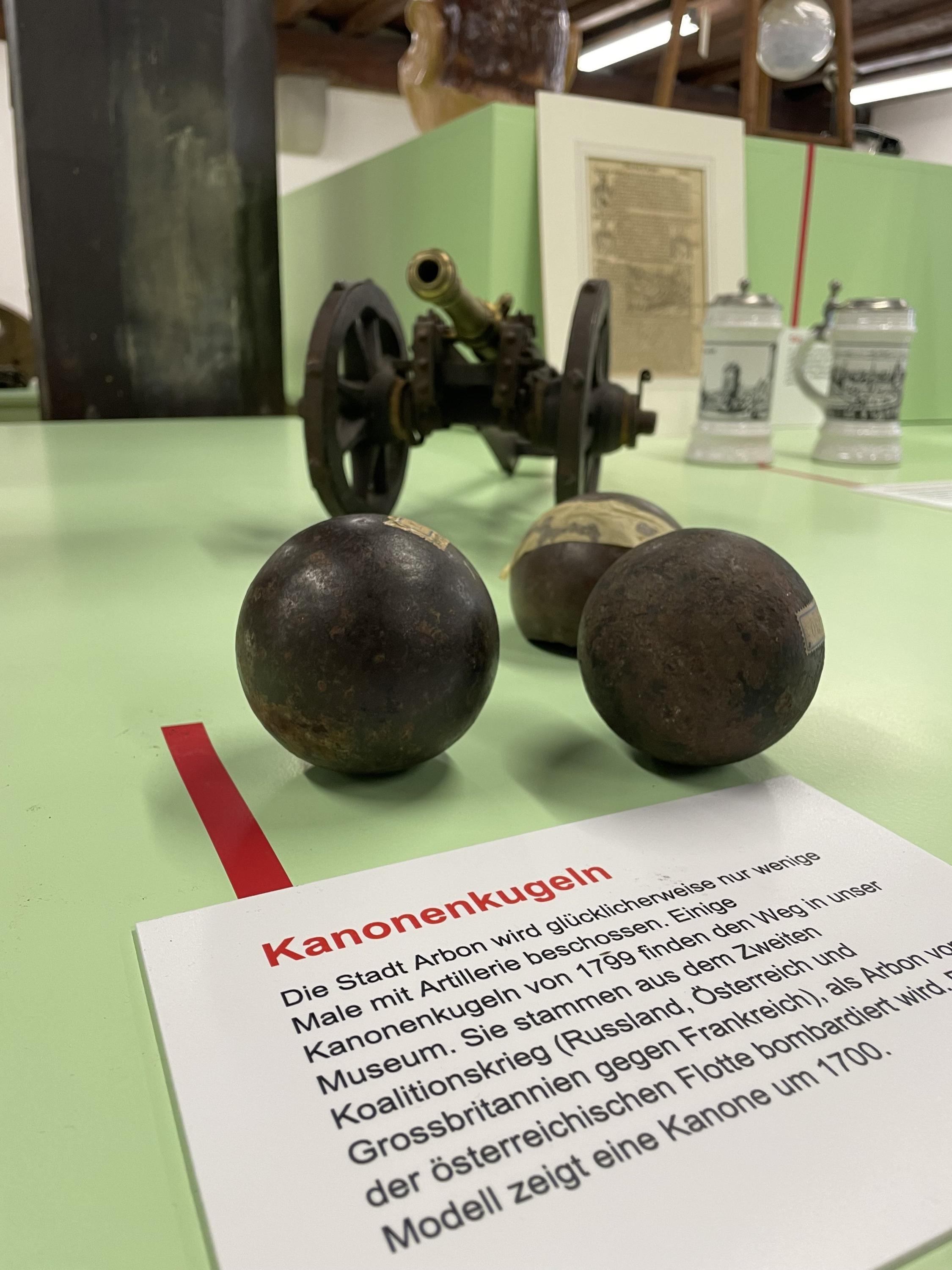 Gleichzeitig gibt es aber auch Objekte, die für besondere Momente in der Geschichte der Stadt stehen. Ein aus dem Jahr 1912 stammendes Velo der viele Jahrzehnte die Stadt prägenden Firma Saurer, eine grosse und kunstvoll gestaltete Fahne der Gewerkschaft der Textilindustrie mit dem Spruch „Einigkeit macht stark“, die an die starke Bedeutung der Gewerkschaft in einer Arbeiterstadt wie Arbon erinnert oder auch Kanonenkugeln aus dem Jahr 1799. Sie wurden im Zweiten Koalitionskrieg, als Russland, Österreich und Grossbritannien gegen Frankreich kämpften, von der österreichischen Flotte Richtung Arbon gefeuert.