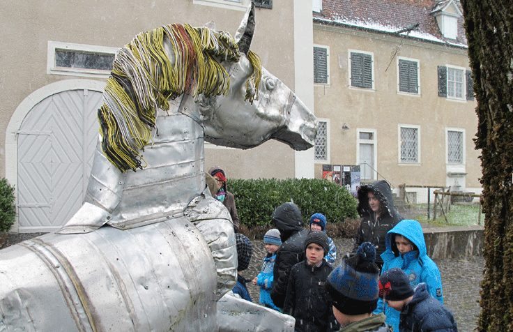 Kinderworkshop mit Nicole Strässle im März 2013 vor dem Topi-Horse Alpo Koivumäkis beim Eingang des Kunstmuseums Thurgau. ©Museum für Kinder Thurgau