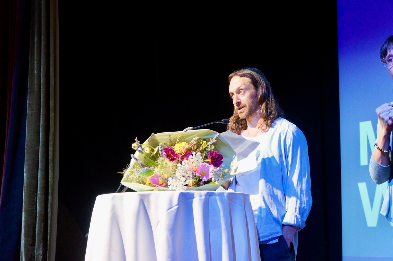 Der Förderbeitrag ist für Reto Friedmann etwas ganz Besonderes: «Meiner Kunst fallen die Herzen nicht einfach zu», sagt er. Gleichzeitig geniesst er die Laudatio von Julia Zutavern, die seinen «dadaistischen Phrasensingsang» lobt. Damit untersuche er die Klanglichkeit der Sprache. «Jetzt weiss ich endlich, was ich mache», lacht Reto Friedmann.