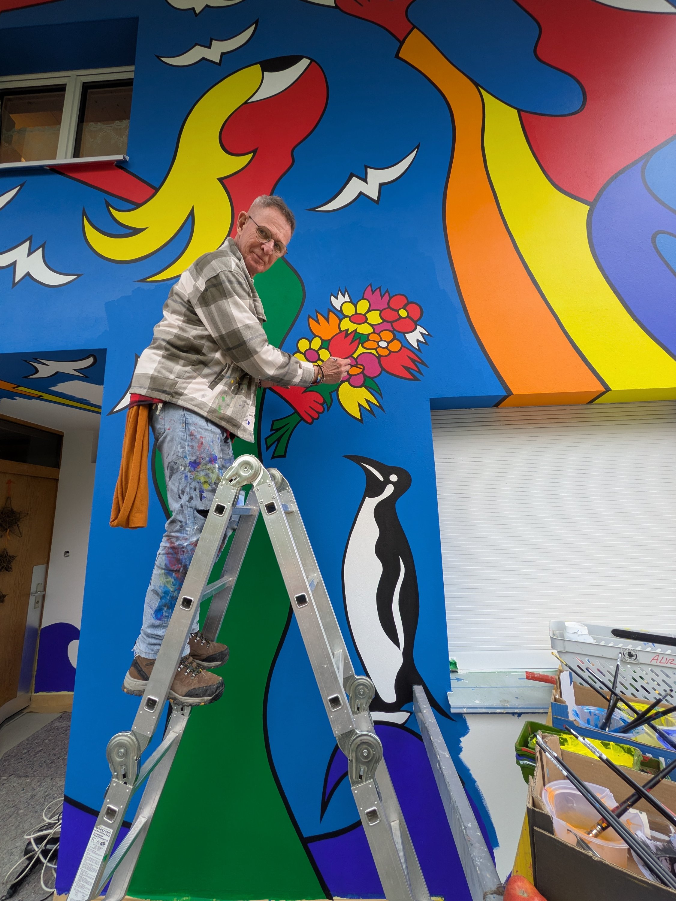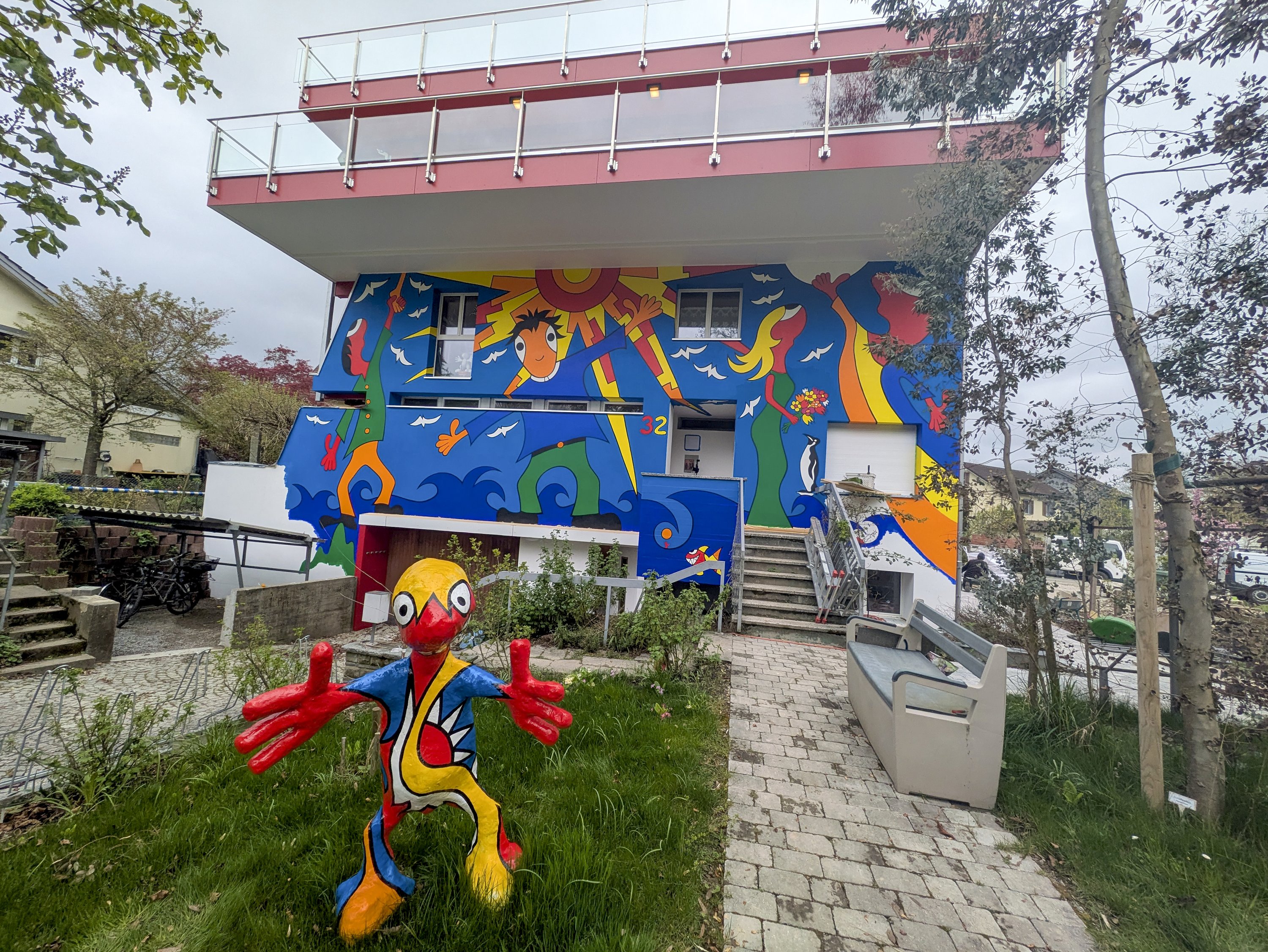 Leute, die pensioniert sind und alleine in Einfamilienhäusern leben, zügelten nicht mehr so häufig, erzählt er. Ihm sei es ein Anliegen gewesen, dass das Haus generationenübergreifendes und inklusives Wohnen bietet. So entsteht ein buntes Miteinander unter einem Dach, so bunt wie das Wandbild an der Fassade.