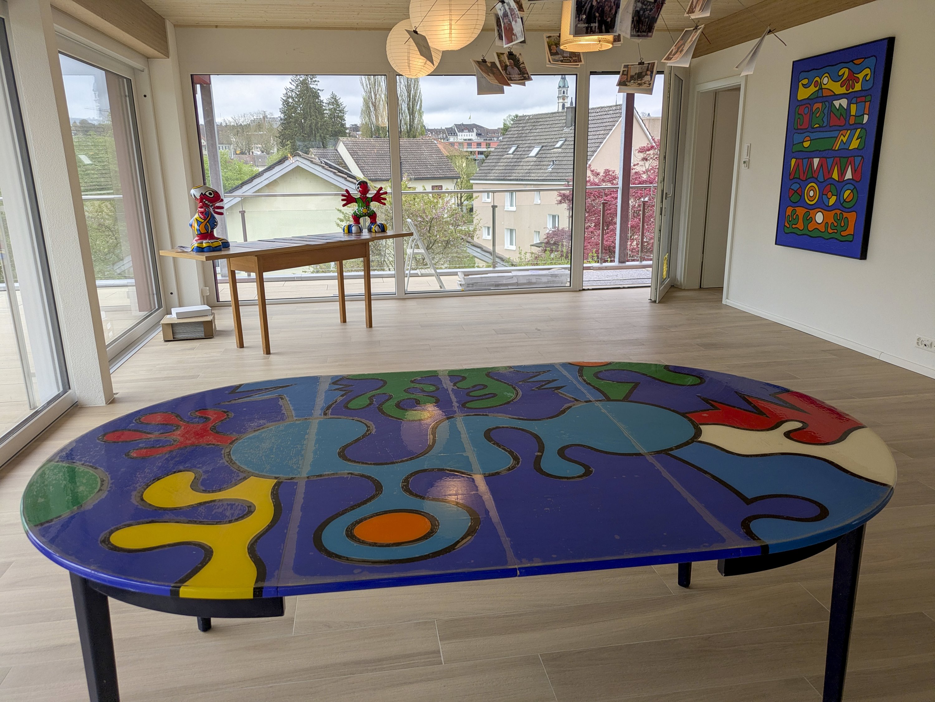 Das ursprünglich zweigeschossige Haus wurde um vier Geschosse erweitert. Mehr als eine Million Franken hat Vetsch in den Umbau investiert. Aus dem unscheinbaren zweigeschossigen Raum wurde ein Haus mit Holzbauweise und hellen Räumen, die die Bilder des Neo-Pop-Art-Künstlers Andi Luzi zum Leuchten bringen. Hier stellt Haru Vetsch seine Sammlung aus. «Ich habe 40 Kunstgegenstände von Andi Luzi gesammelt», sagt Haru Vetsch.