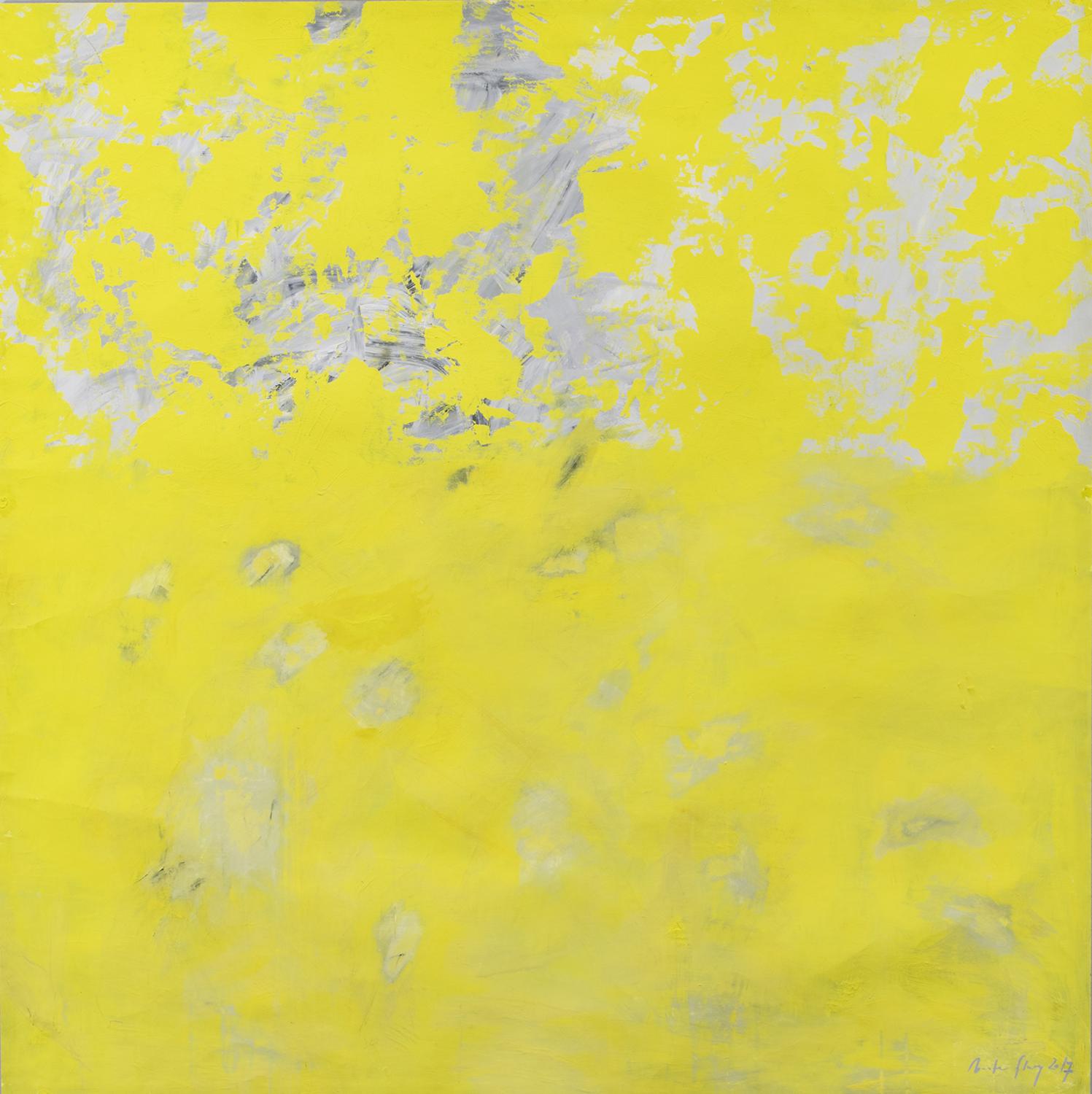 Renate Flury (*1953 in Zürich), lebt und arbeitet in Weinfelden, Gemälde "Ohne Titel", 2017, Gouache auf Halbkarton, 148 x 148 cm Dazu schreibt Markus Landert: «Das von der Ankaufskommission erworbene Werk von Renate Flury war Teil der Ausstellung "Pinsel, Pixel und Pailletten – Neue Malerei" im Kunstmuseum Thurgau, die Anfang 2020 einen Überblick über die avanciertesten Positionen der Malerei im Thurgau gab. Ihre grossformatigenGemälde werden meist von einem Farbklang aus zwei oder drei Tönen dominiert. Fragile Formfragmente ziehen wie Wolkenfetzen im Sturm über den Himmel, Leerstellen hinterlassend. Es entstehen durchlässige Strukturen. Manchmal verschmilzt die Farbe auch zu weich und tiefenräumlich wirkenden Kratern – wie im angekauften Werk das Gelb mit einem dahinterliegendenGrau. Der Farbsog und die flirrenden Formen darüber suggerieren ständige Bewegung, doch ohne körperliche Anwesenheit, allein die Künstlerhand verweist noch auf eine solche. Eine gegenständliche Welt ist nicht auszumachen in diesen quadratischen Bildern, es sind rein energetische Räume und mentale Sphären. Im Spannungsfeld zwischen der Anwesenheit der malerischen Spur und dem Immateriellen findet eine spielerische Kommunikation mit anderen Wirklichkeiten statt.»