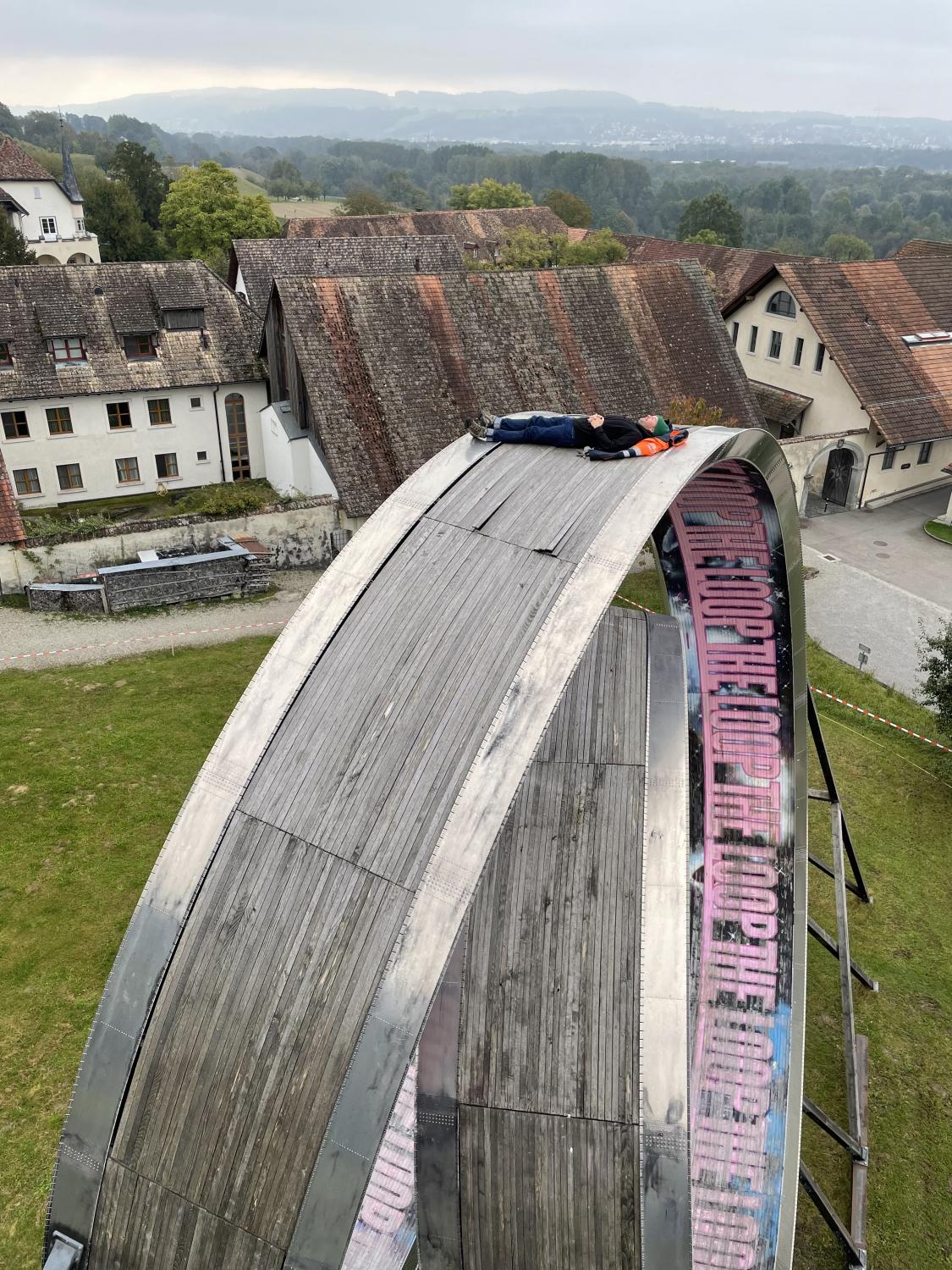 Eigentlich sollte hier längst wieder grüne Wiese das Blickfeld dominieren. Die Grossskulptur „Loop“ des Künstler-Duos Bildstein⎪Glatz sollte bereits im vergangenen Jahr abgebaut werden. Aber auch hier machte die Pandemie einen Strich durch die Rechnung - unter Corona-Bedingungen war die Demontage mit vielen Beteiligten aus unterschiedlichen Ländern kaum zu organisieren. So verblieb der Doppellooping noch eine Weile länger vor den Toren der Kartause Ittingen und wurde inzwischen fast schon selbst zu einem ikonischen Bild für den Ort.