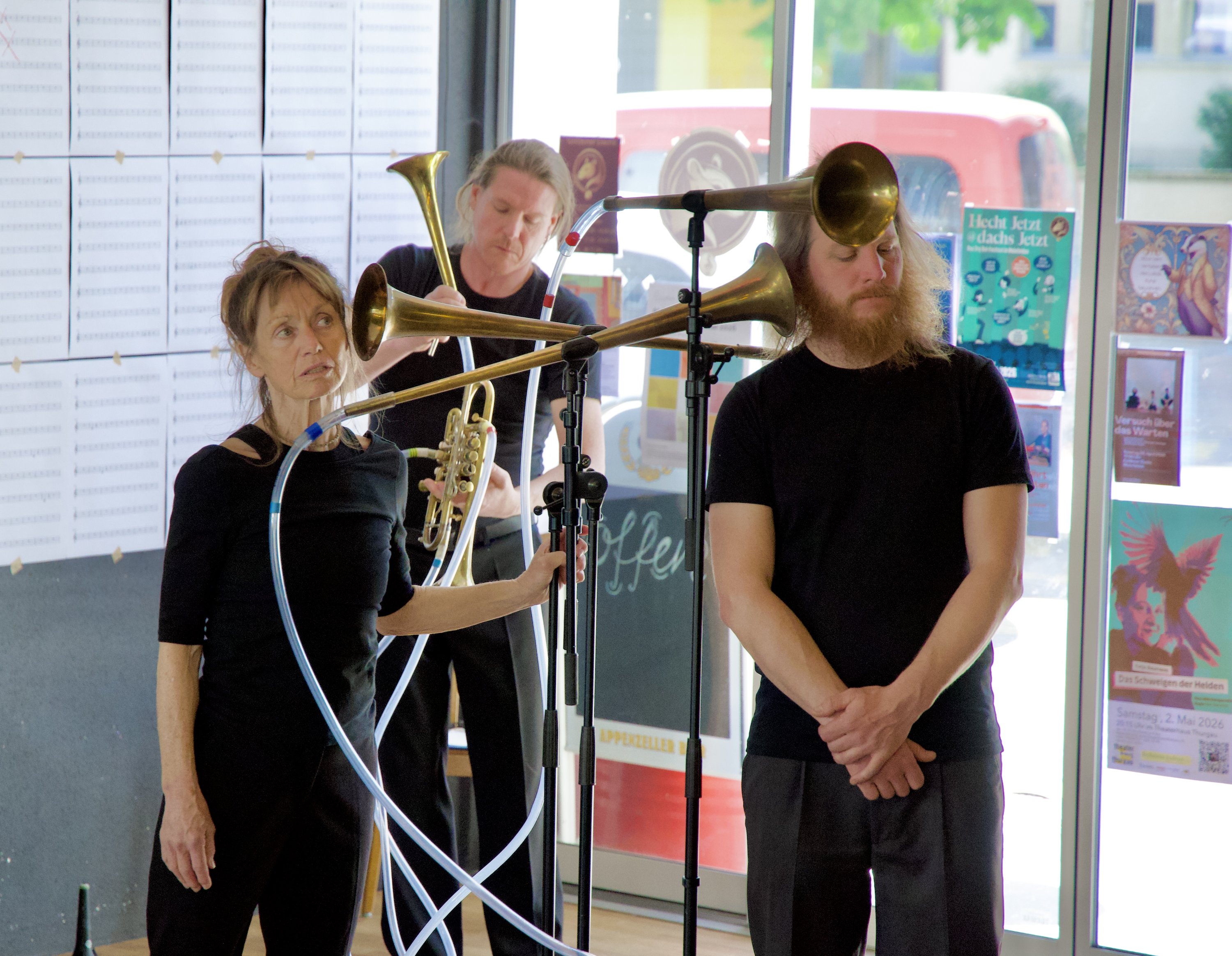 Christoph Luchsingers Komplizin, die vielköpfige Schlauchtrompete, spielte wiederum eine besondere Rolle in der strengen Ordnung der Abläufe und Bewegungselemente. Einerseits Vermittlerin von erratischen Anweisungen an die Nummerierten, einer stillen Post im Klangkanal, produzierte Luchsinger, die Töne abhakend, eine Melodie, die durch sehr lange Pausen unterbrochen war.
