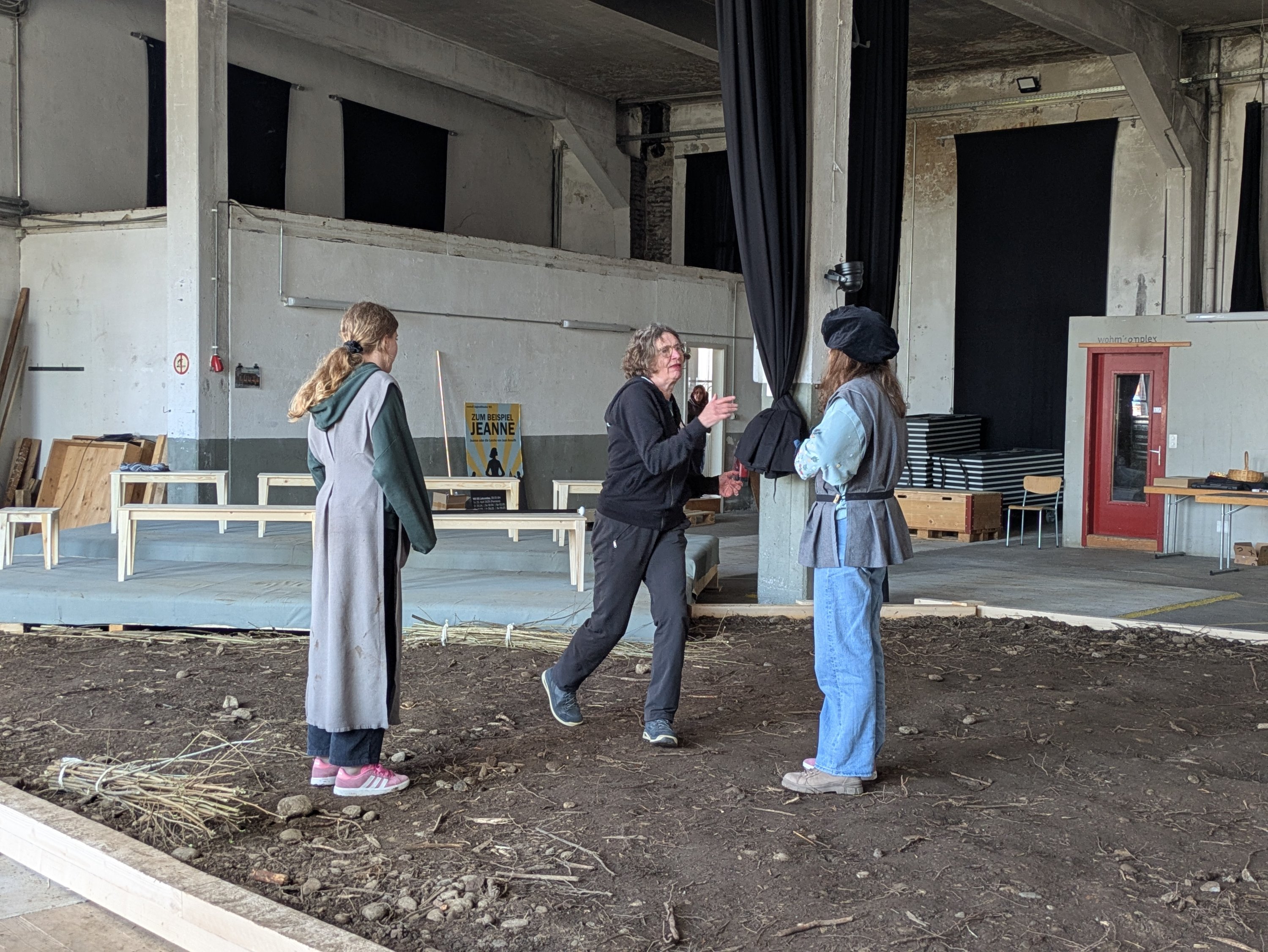 Die Hauptfigur des Stücks, Jeanne d'Arc, steht in Anorak und rosa Turnschuhen auf der Bühne, ihr Vater, gespielt ebenfalls von einer weiblichen Darstellerin, trägt zwei Paar verschiedene Schuhe: rechts beige Winterstiefel, links rosafarbene Turnschuhe. Sie hat einer Kollegin, die in Turnschuhen zur Probe kam, einen ihrer Stiefel geliehen, damit es sie nur an einem Fuss friert, berichtet sie lachend.