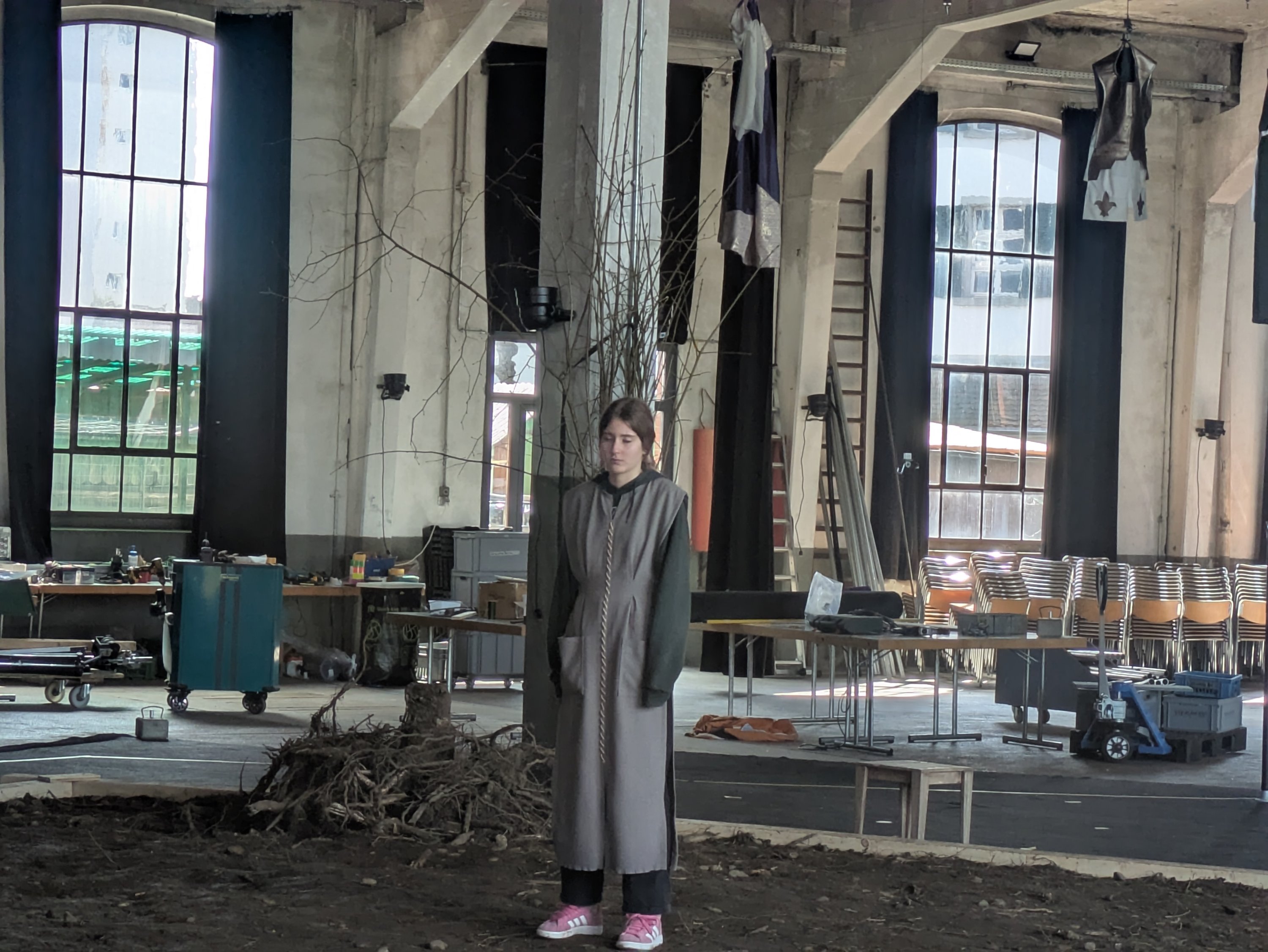Die Kulisse besteht aus einem grossen Beet aus Erde, auf dem sich Wurzelholz verteilt. Genauer gesagt, zehn Kubikmeter Erde, die eigens für das Stück «Zum Beispiel Jeanne» angeliefert wurden. Auf dem Erdboden krümmt sich Jeanne, die von ihrem Vater geschlagen wird, weil sie berichtet, dass sie Stimmen hört.