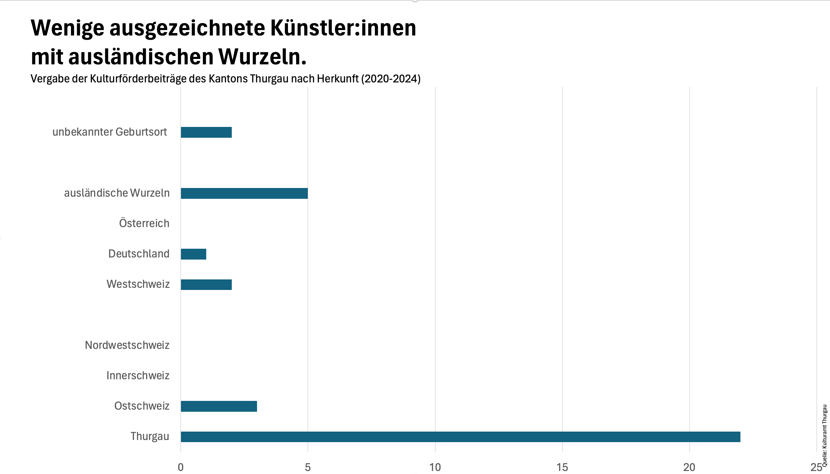 Herkunft: 22 gebürtige oder im Thurgau aufgewachsene Künstler erhielten den Preis, drei Ostschweizer, zwei Westschweizer und ein Deutscher. Nur fünf der Förderbeitragsgewinner:innen hatten ausländische Wurzeln. Bei zweien ist der Geburtsort unbekannt.