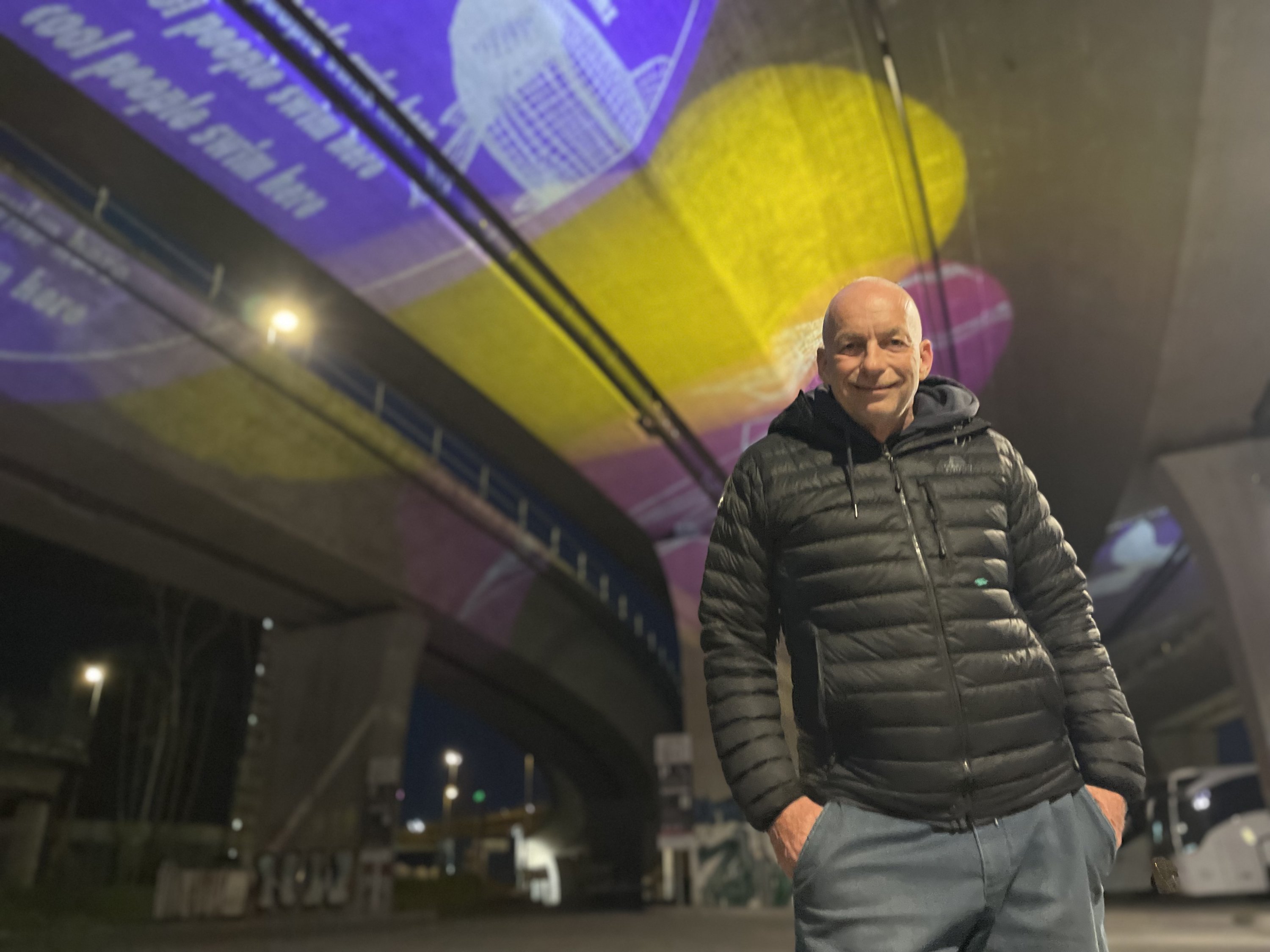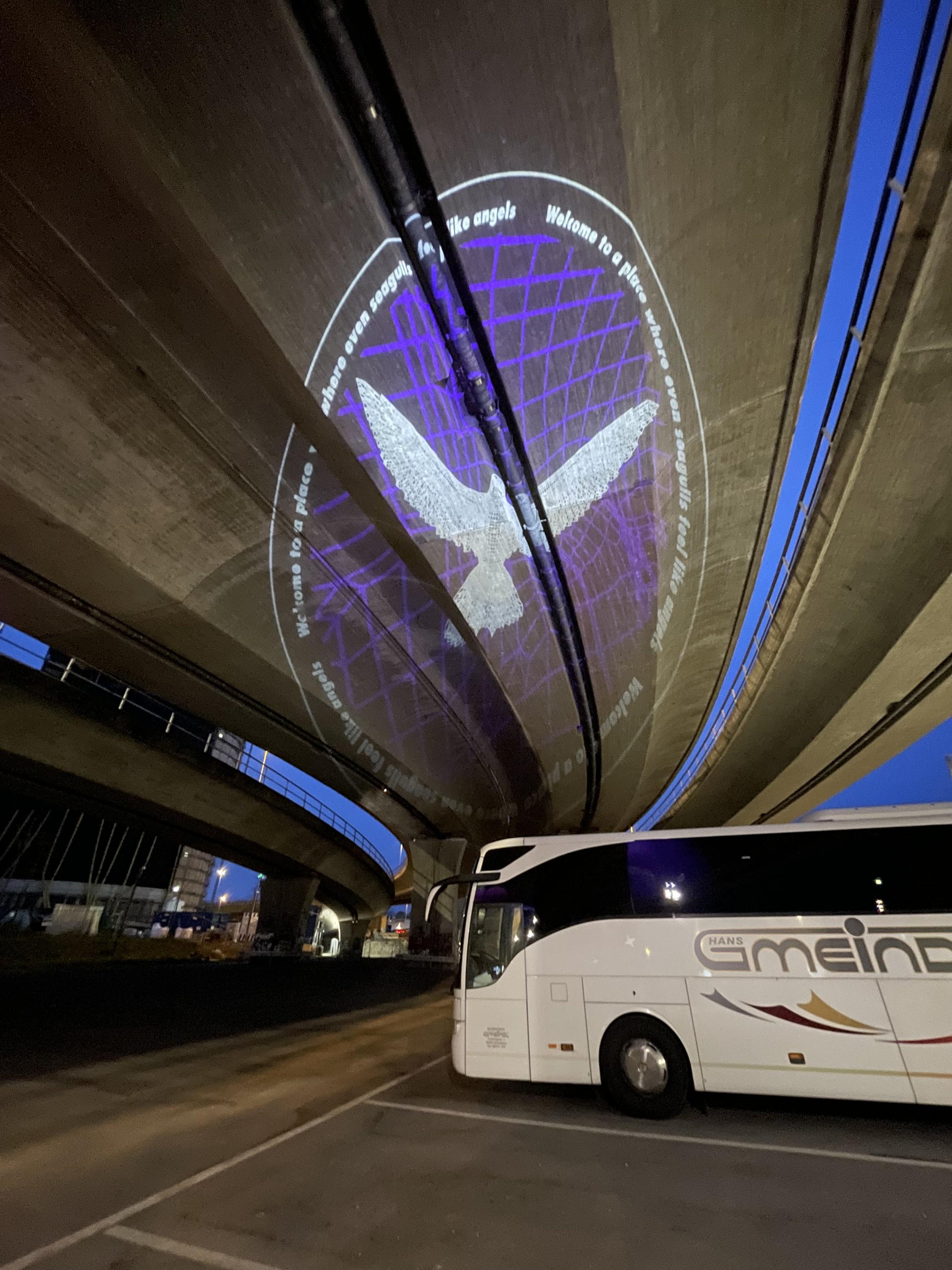 Seine Idee für den Busbahnhof: Mit bunter Farbigkeit und künstlerischen Motiven den Angstraum umdeuten. Leuchtendes Grün, strahlendes Pink, beruhigendes Gelb erhellen nun die Fahrbahnunterseite der Europabrücke. Der graue Beton wird zur Gestaltungsfläche; street-art-gleich bespielen Brenners Motive diesen so ganz und gar unkünstlerischen Ort. Man sieht Möwen, die auf Friedenstaube machen, Fische, die scheinbar abtauchen, und Wasservögel, die sich in die Luft erheben. «Ich wollte, dass der Ort hier Bezug nimmt auf die Stadt, auf den See, auf das, was man mit Konstanz verbindet», sagt Markus Brenner.