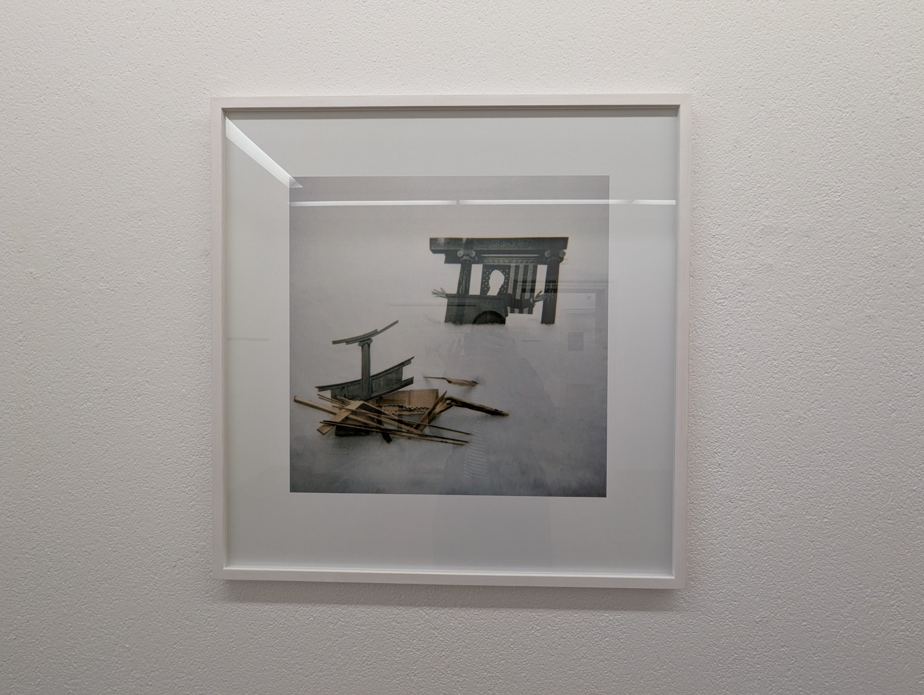 Später gestaltet er komplexere, beinahe kulissenhafte Strukturen und mischt Zeitungsausschnitte mit anderem Material; für den Betrachtenden ist es mitunter nicht mehr klar erkennbar, was gebaute Kulisse, Zeitungsausschnitt, real oder inszeniert ist. Die Frage, was Bild ist und was Darstellung, bleibt bewusst offen. So taucht in der Fotografie «IN GOD WE TRUST» (2000) eine Kulisse mit ehemaligem amerikanischem Präsidenten mitsamt zerstörter vorgelagerter Architektur auf. Eine über 25 Jahre alte Arbeit, die unter heutiger Perspektive etwas dystopisch Visionäres hat.
