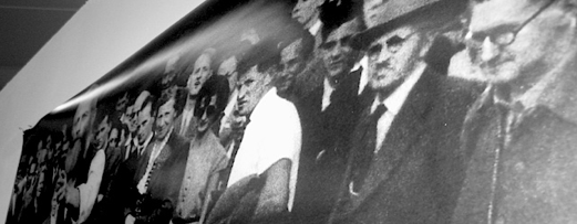Kundgebung in Zürich 1933. Links mit Bart Max Daetwyler, rechts Bertold Brecht. Bild aus der Ausstellung im Kunstraum/Brigitta Hochuli