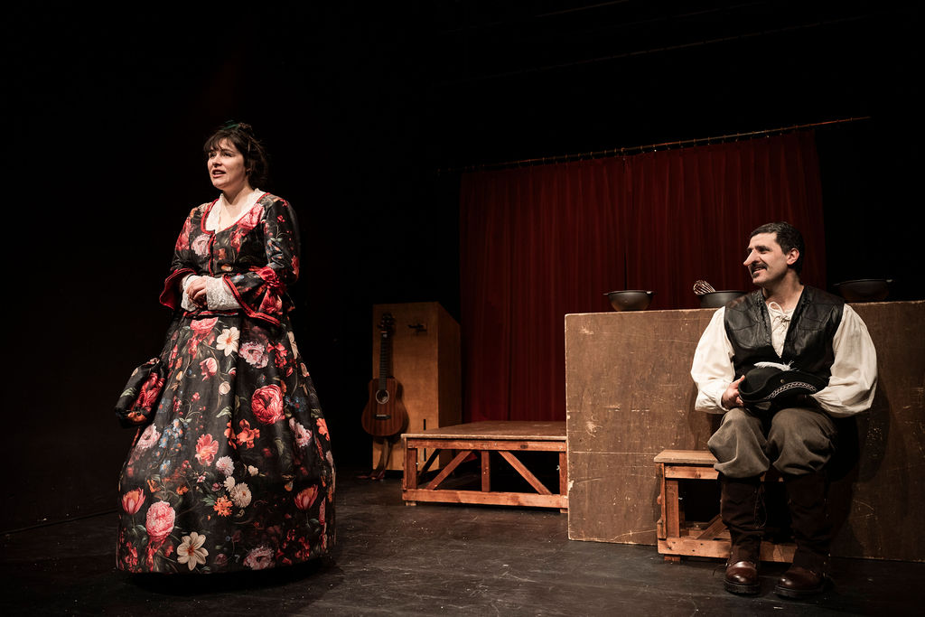 «Perfect» von Ed Sheeran ist denn auch einer der Songs, die a cappella oder mit Gitarrenbegleitung angestimmt werden, manchmal in der Absicht, das Publikum emotional zu umgarnen, manchmal als ziemlich schrille Unterstreichung des Bühnengeschehens. Auf jeden Fall trägt es zur kurzweiligen Unterhaltung bei, die das «Schauspiel mit Musik» vor allem ist. Die Inszenierung von Markus Keller nutzt mit Gewinn die Musikalität des zapzarap-Ensembles für einige Live-Vocals, vom Antikriegssong (schliesslich geht’s auch in den Kampf mit den Spaniern mit tragischem Ausgang) über die West Side Story bis hin zum melancholischen Trinklied «Tourdion».