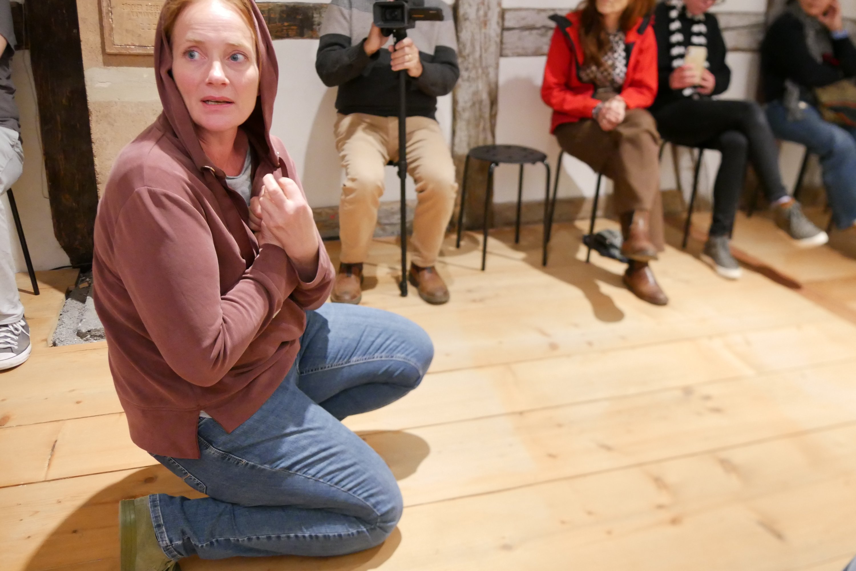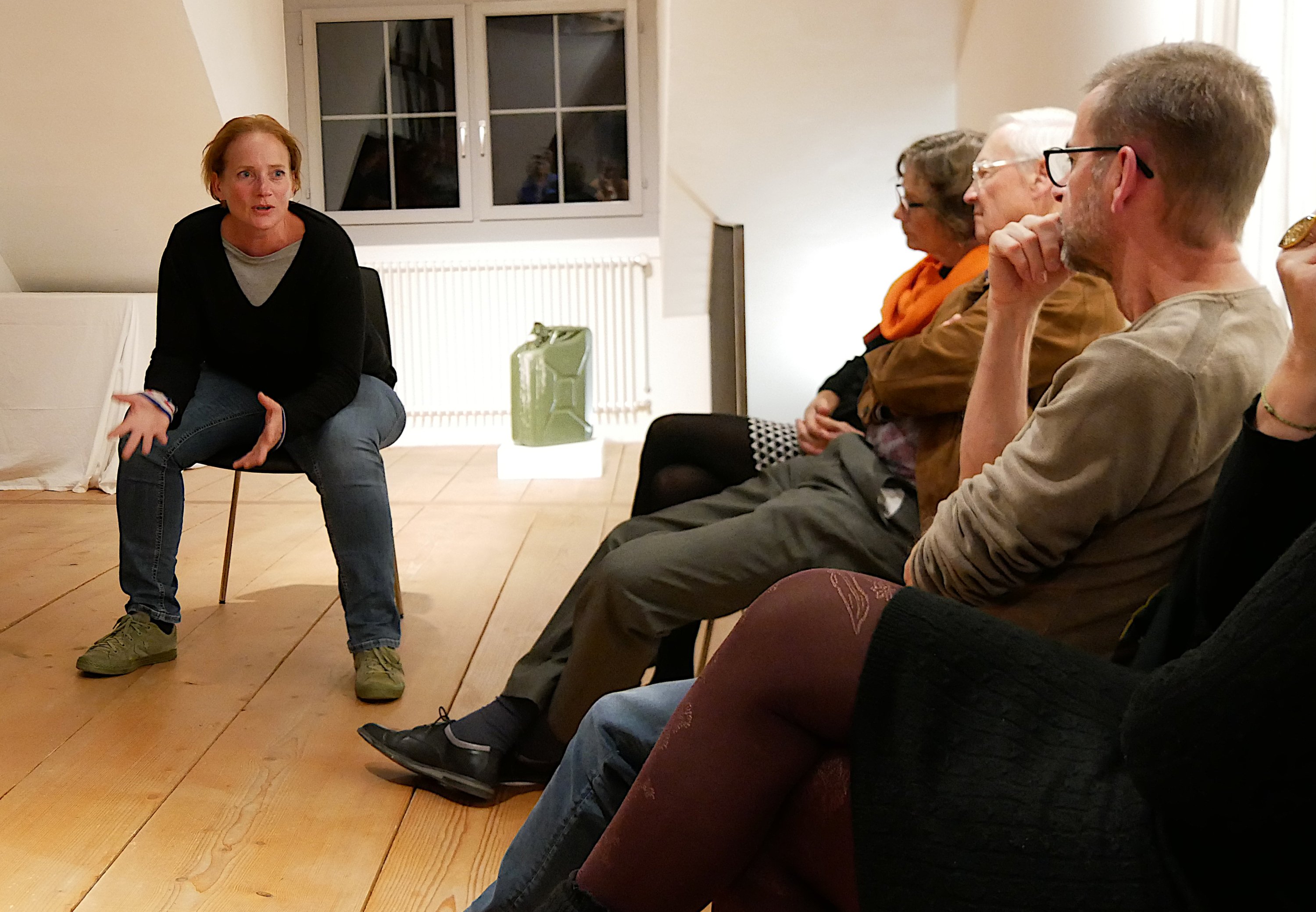 Zwei Stuhlreihen mit einigen Metern Abstand stehen sich auf dem bemerkenswert schrägen Boden im Dachgeschoss des Hauses zur Glocke gegenüber. Hier sitzt das Publikum am Abend des 15. Oktobers, an dem Eva Kammigan ein Gastspiel in Steckborn gibt. Zwei Stühle auf der jeweiligen Stirnseite sind für die Schauspielerin Eva Kammigan reserviert. Der Gang, der so entsteht, und die beiden Stühle als gegenübergestellte Pole dienen ihr als Bühne. Hinter einem dieser Stühle steht noch ein grüner Benzinkanister – in Anbetracht des Titels des Theaterstücks, das an diesem Abend gezeigt wird, ein bedrohlicher Gegenstand.