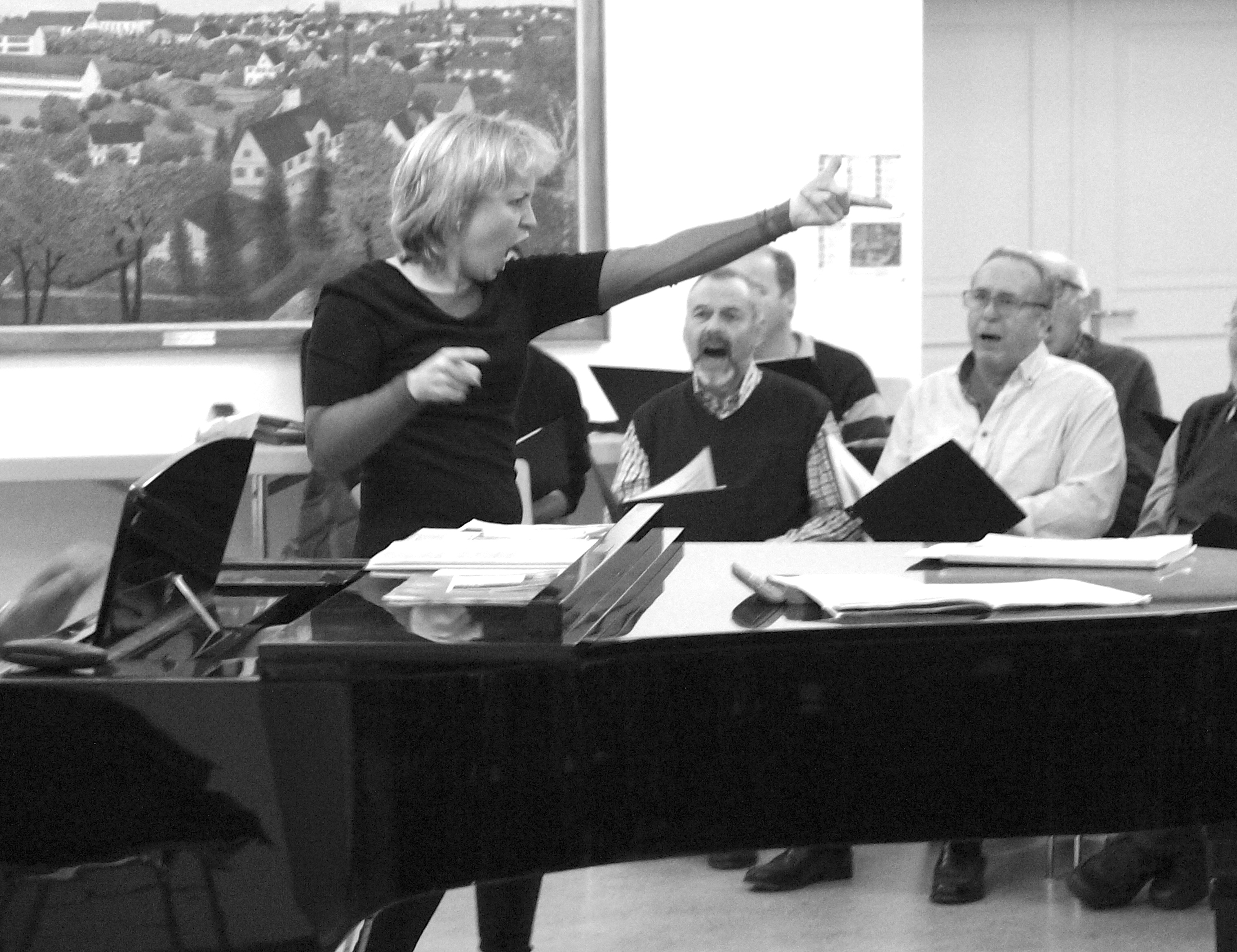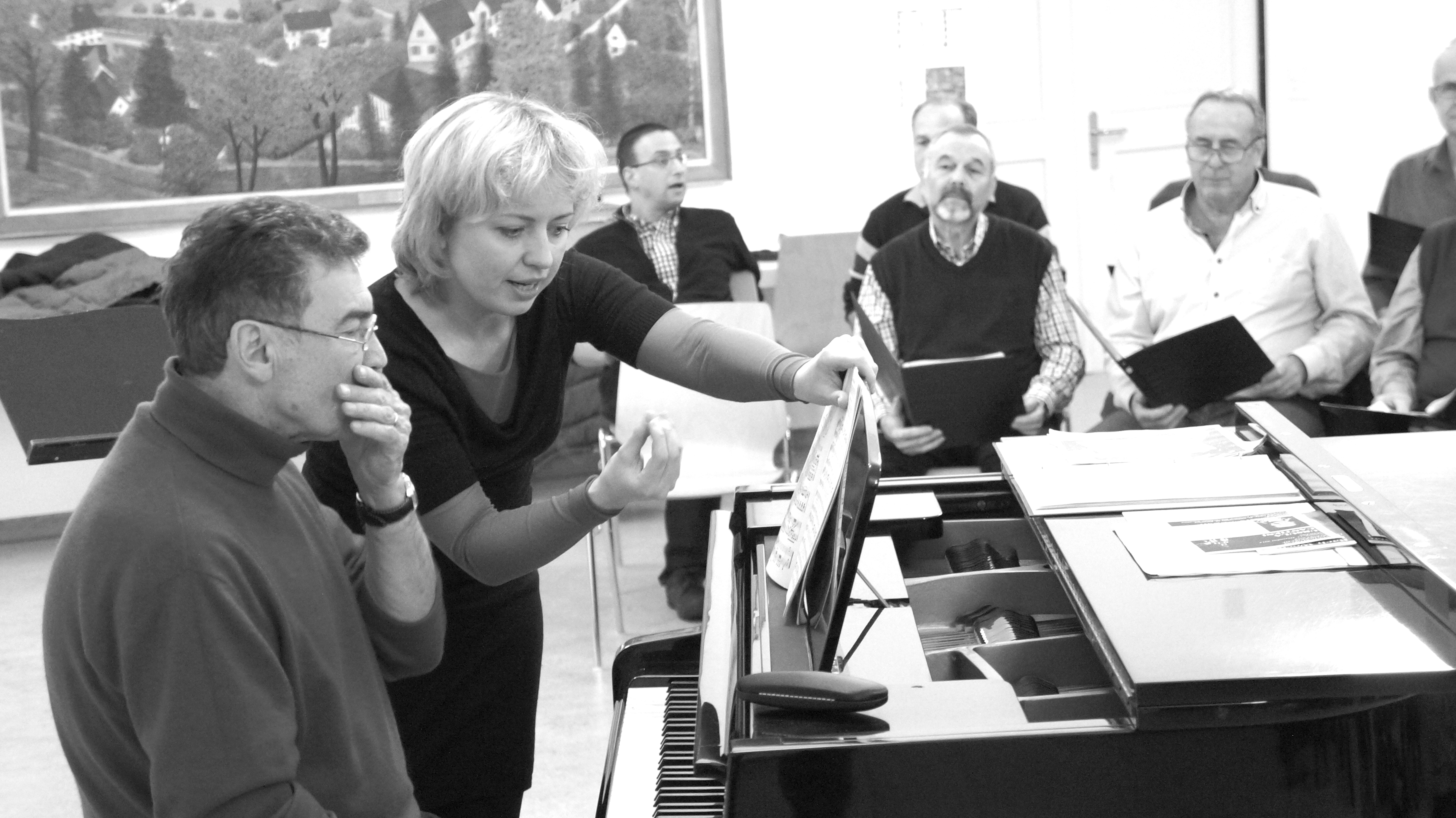 Heute bei der ersten Probe mit der berühmten Gast-Dirigentin geht es darum, sich gegenseitig kennenzulernen. Anna Skrileva hat damit keine Probleme: „Guten Abend, Jungs“, begrüsst sie die Herren. „Herr Biegert hat uns gut trainiert“, sagt Peter Dransfeld. „Ich hoffe, dass wir wenigstens ungefähr Ihren Erwartungen entsprechen.“ Offensichtlich sieht die Künstlerin aber noch ein paar Baustellen. Alle paar Takte unterbricht sie den „Jägerchor“ aus dem Freischütz. Mal stimmen die Akzente nicht, dann die Artikulation, dann fordert sie mehr Temperament. „Sie müssen noch virtuoser werden“ fordert sie. „Ich weiss aus meiner Erfahrung, dass sich beim Jägerchor die Hörner präsentieren müssen“, erklärt sie. „Und deshalb müssen Sie Ihr Tempo den Hörnern anpassen und nicht umgekehrt. Es darf nie bequem für Sie sein! Ich spiele es mal kurz vor“. Sagt’s und schiebt Claus Gunter Biegert vom Klavierhocker. Er nimmt es gelassen und stellt sich vor seine Sänger: „Ich bin schuld“, bekennt er. „Ich habe ihnen gesagt, dass sie es so singen sollen“. „Und dann kommt die Dirigentin und macht alles anders“, beendet Anna Skryleva den Satz lachend.