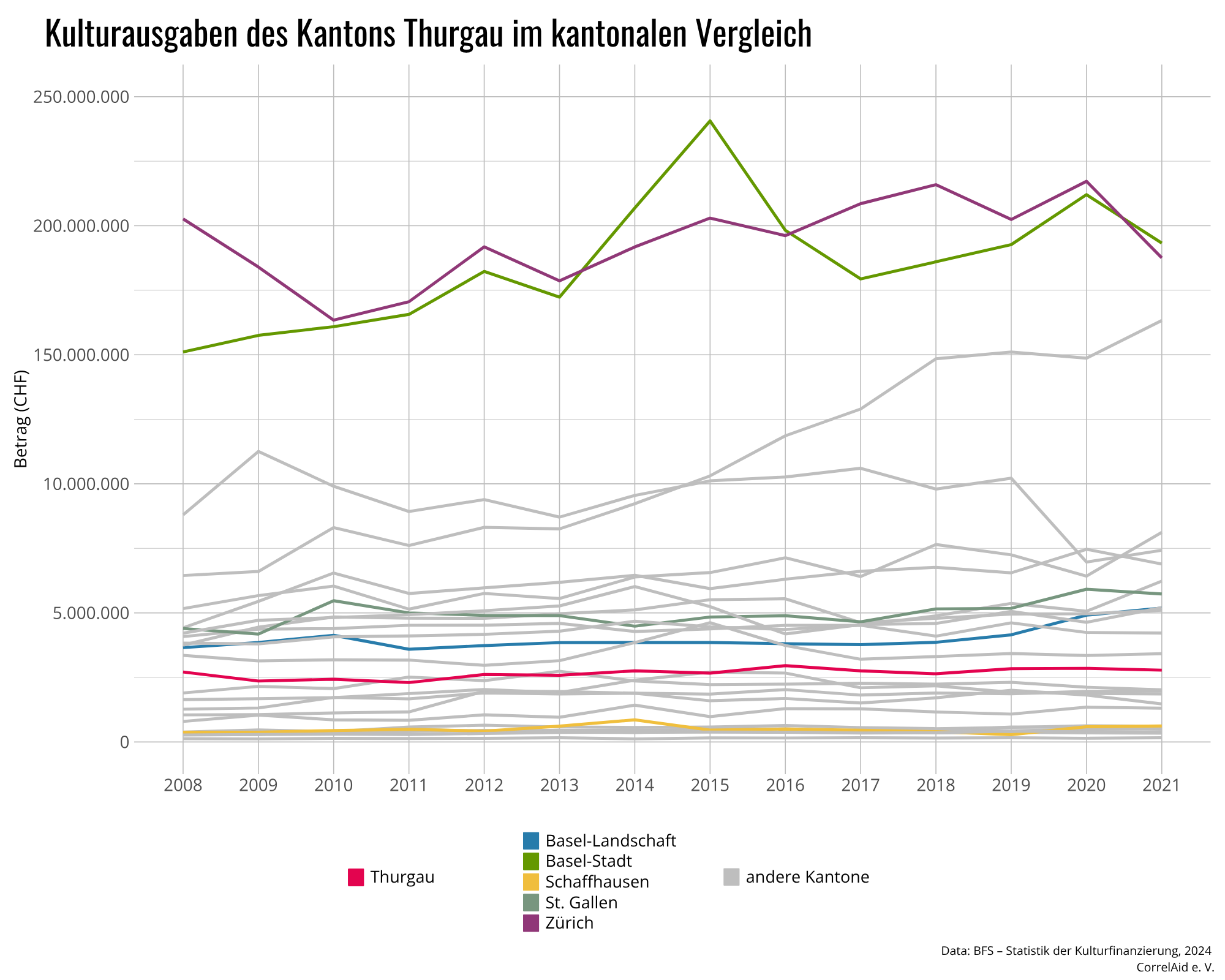 Mit 98 Franken pro Einwohner unterstützt der Thurgau seine Kultur (2021) und liegt damit in Reichweite zum Nachbarn aus St. Gallen (111 Franken). Schaffhausen berappt 74 Franken pro Kopf für sein Kulturleben. Basel-Stadt liegt in der Rangliste unangefochten vorne mit fast 984 Franken pro Einwohner. Zürich liegt bei 120 Franken pro Einwohner.
