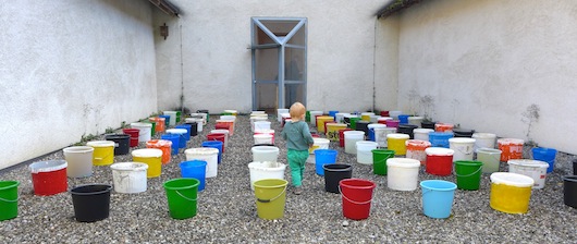 Auch im hortulus conclusus von Sophie LéCuyer ist nur aaluege erlaubt. Aber Hindurchrennen durch dieses zauberhaufte Gewächshaus der Schatten- und Lichtpflanzen gestatten wir uns dann doch. „Nomol ine“, jauchzt die Kleine. Am Schluss haben wir den Parcours fünf Mal absolviert und müssen an die frische Luft. Dort, wo dereinst das neue Kunstmuseum stehen soll, hüpfen wir durch steffenschönis Wassergarten mit rund 100 Kübeln. „Was hets do drin?“ Wir verraten es nicht.