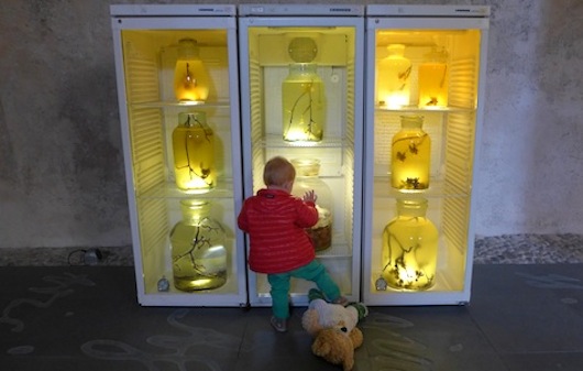 „Sind Öpfel“, vermutet das Kind. Und tatsächlich: bei konstanten 5 Grad Celsius konserviert sie Daniel Bräg in ihren Stadien von Wachstum und Fäulnis. Dass es dabei auch um den Dialog mit Joseph Kosuths Verstummter Bibliothek geht, auf der die Schränke stehen, entgeht dem Kind. Mehr Verständnis hat es für steffenschoenis Fototafeln mit japanischen Nutzgärten. Man könnte herrlich damit spielen; Omama verbietet‘s. „Cha me aaluege“, sagt das Kind.