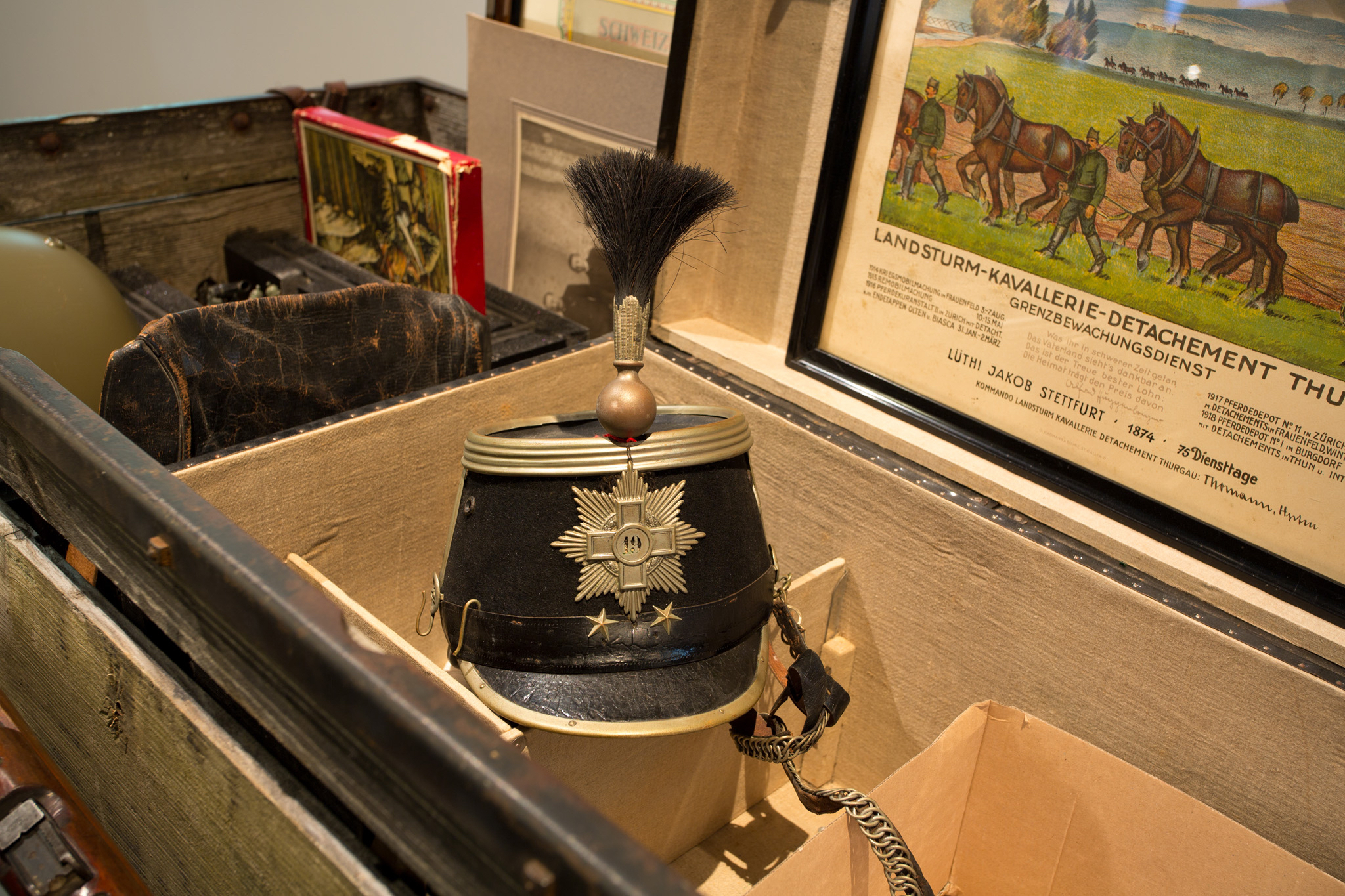 Landwirt Johann Jakob Lüthi aus Stettfurt wurde trotz seines Alters von 40 Jahren noch eingezogen. Gemeinsam mit seinem Pferd Acida ging er zur Kavallerie. Sein Tschako, sein Dienstbüchlein und das seines Pferdes liegen in der Ausstellung auf einem Objektwagen, einem alten Handkarren. Das Publikum darf an Führungen die Originalgegenstände der Thurgauer Persönlichkeiten in die Hand nehmen. «Dies ist ein einzigartiges und innovatives Vermittlungsangebot, die Epoche lässt sich anhand der Lebensgeschichten förmlich ertasten», betont Dominik Schnetzer.