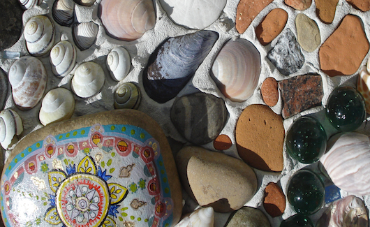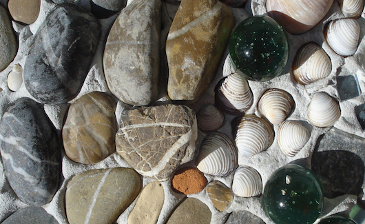 Natürlich blieb es nicht nur beim Bewundern. Fleissig sammelten wir da eine Muschel und dort einen Stein und hatten bald ein Säckli voll bestens geeigneter Fundstücke. Denn später, zu Hause, konnten wir an unserem Erinnerungs-Mosaik weiterbauen. Auf dem Kellertreppen-Mäuerchen versammeln sich nämlich sämtliche Ferienschätze, die sich in den jeweils frischen Mosaik-Zement drücken lassen. Nun haben wir nebst den italienischen Austern und französischen Miesmuscheln auch einheimische Schneckenhäuser und eben die Thurgauer Zebramuscheln.