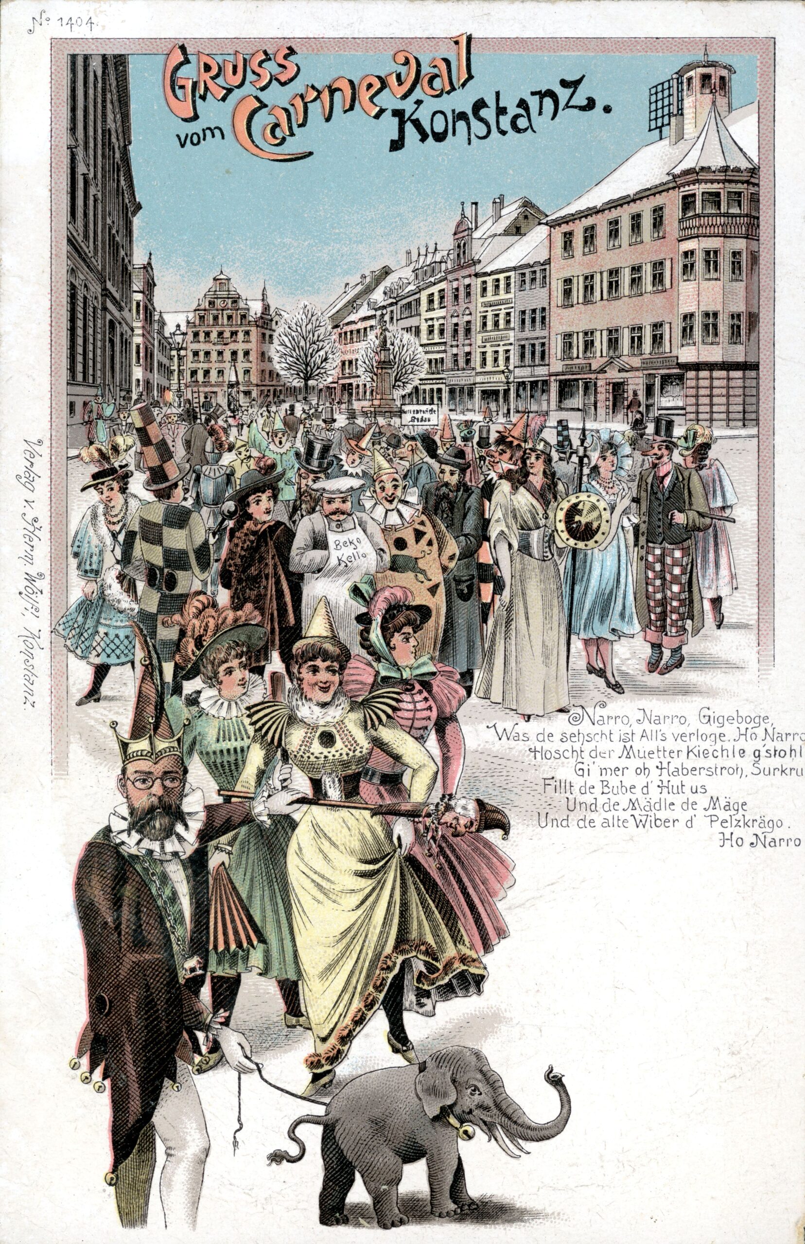 Prunksitzungen mit Elferrat, Umzüge und Fastnachtsbälle. So grüsst „Prinz Karneval“ auch aus Konstanz, wie zeitgenössische Postkarten zeigen. Immer mehr Karnevalsgesellschaften wurden gegründet und Legenden neu belebt. Ein loser Schülerbrauch, der Hemdglonkerumzug, entstand wohl erst Ende des 19. Jahrhunderts, auch wenn sich die „Elefanten AG“, die erste Konstanzer Narrengesellschaft bemühte, den Brauch auf 1604 vorzudatieren.