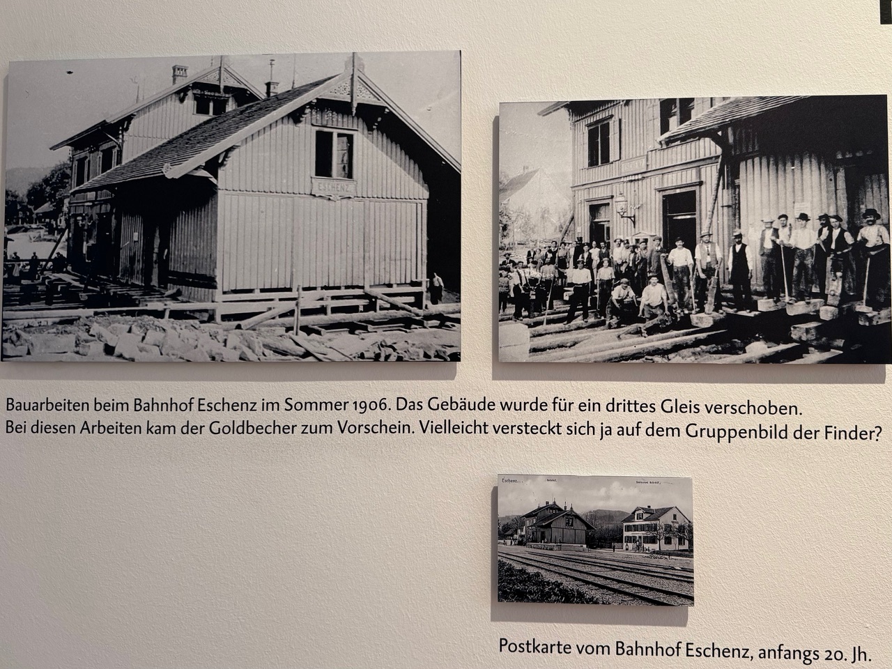 Neu ausgestellt sind zwei Fotografien aus dem Jahr 1906. Urs Leuzinger wollte die Fundgeschichte aufrollen und suchte deshalb gezielt nach Aufnahmen des Bahnhofs von Eschenz. Er wurde fündig. Ein befreundeter Eisenbahnfan hatte in seinem Archiv zwei Fotos von den damaligen Bauarbeiten.