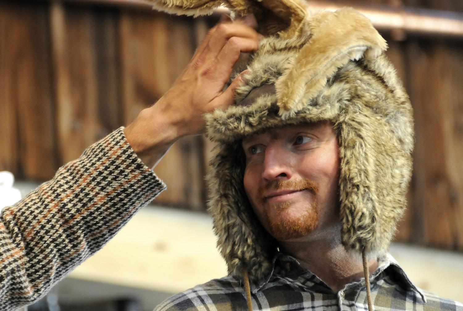Die Geschichte, wenn es denn schon ein Märchen auf der Bühne sein soll, muss also heute sicher etwas anders erzählt werden als bei den Brüdern Grimm, die sie vor etwa 200 Jahren aufgeschrieben haben. Und so startet sie nach einer Einleitung durch die Märchenerzählerin Dorothee mit einem Blick auf die Ziege, die durch ihre „Falschaussage“ das Drama der Vertreibung auslöst. In der Hagenwiler Variante (Text und Regie: Rahel Roy und Florian Rexer) ist sie keinesfalls bösartig, sondern nur furchtbar vergesslich. Im ersten Bild taucht die Geiss nun also als liebenswertes Geschöpf „Mäh“ auf, das von Jan Opderbeck als Handpuppe geführt wird. Dass sie einfach nur vergessen hat, dass sie ordentlich gefressen hatte, mag man ihr nachsehen. Und sie schämt sich auch ordentlich dafür, dass der Vater nun glaubt, seine Söhne hätten die Ziege nicht verantwortungsvoll gehütet. Gut, dass dieser Vater erst ganz am Ende kurz auf der Bühne auftauchen wird – denn was soll man ihm schon zugute halten? „Stellt euch das mal vor!“, muss dann auch Fräulein Dorothee einwerfen, als klar ist, dass der Vater alle Söhne davongejagt hat.