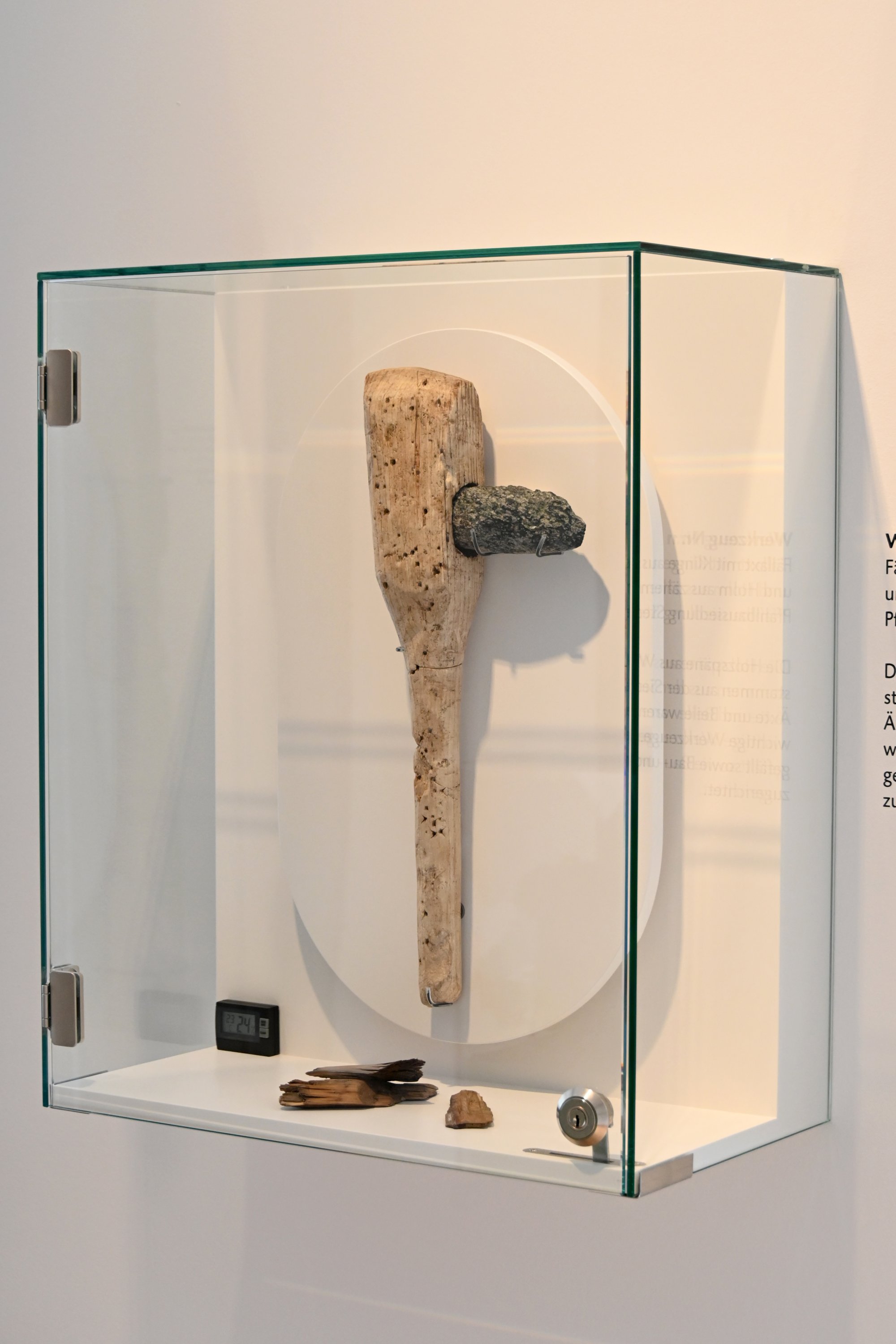 Für den Griff verwendeten die Pfahlbauer einen dünnen Eschenstamm – eine Holzart, die durch ihre Härte und Elastizität bestens als Werkzeuggriff geeignet ist und bis heute im Werkzeug- und Sportgerätebau geschätzt wird.