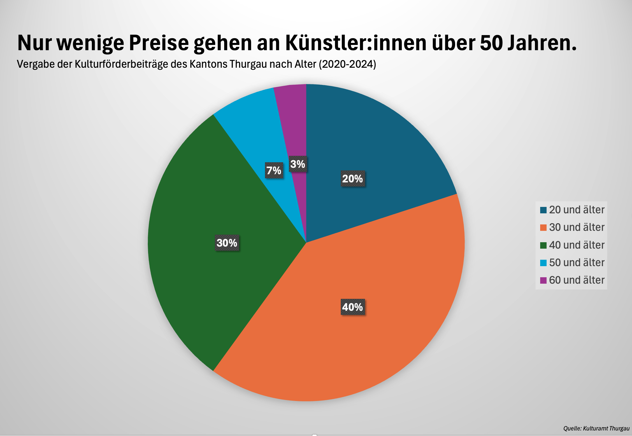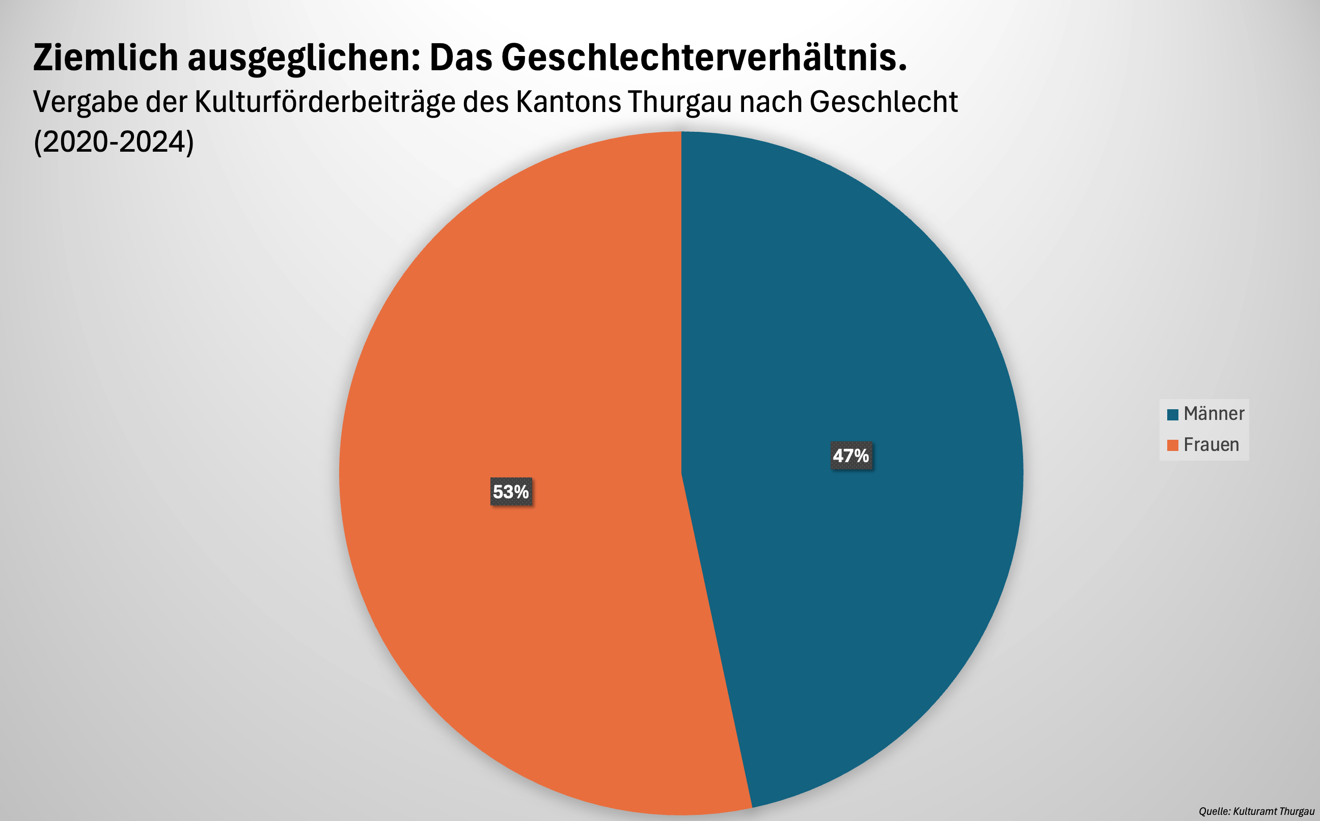 Wir haben die Ausschreibung zum Anlass genommen, die Vergabe der Förderbeiträge mal genauer anzuschauen. Wie gerecht werden die Preise vergeben? Profitiert eine Sparte besonders? Erhalten mehr Männer oder mehr Frauen die Auszeichnung? Gewinnen eher jüngere oder ältere Kulturschaffende? Und welchen Einfluss hat die Herkunft auf den Preis? Neben der quantitativen Analyse haben wir auch Einzelgespräche mit Thurgauer Künstlerinnen und Künstlern geführt.