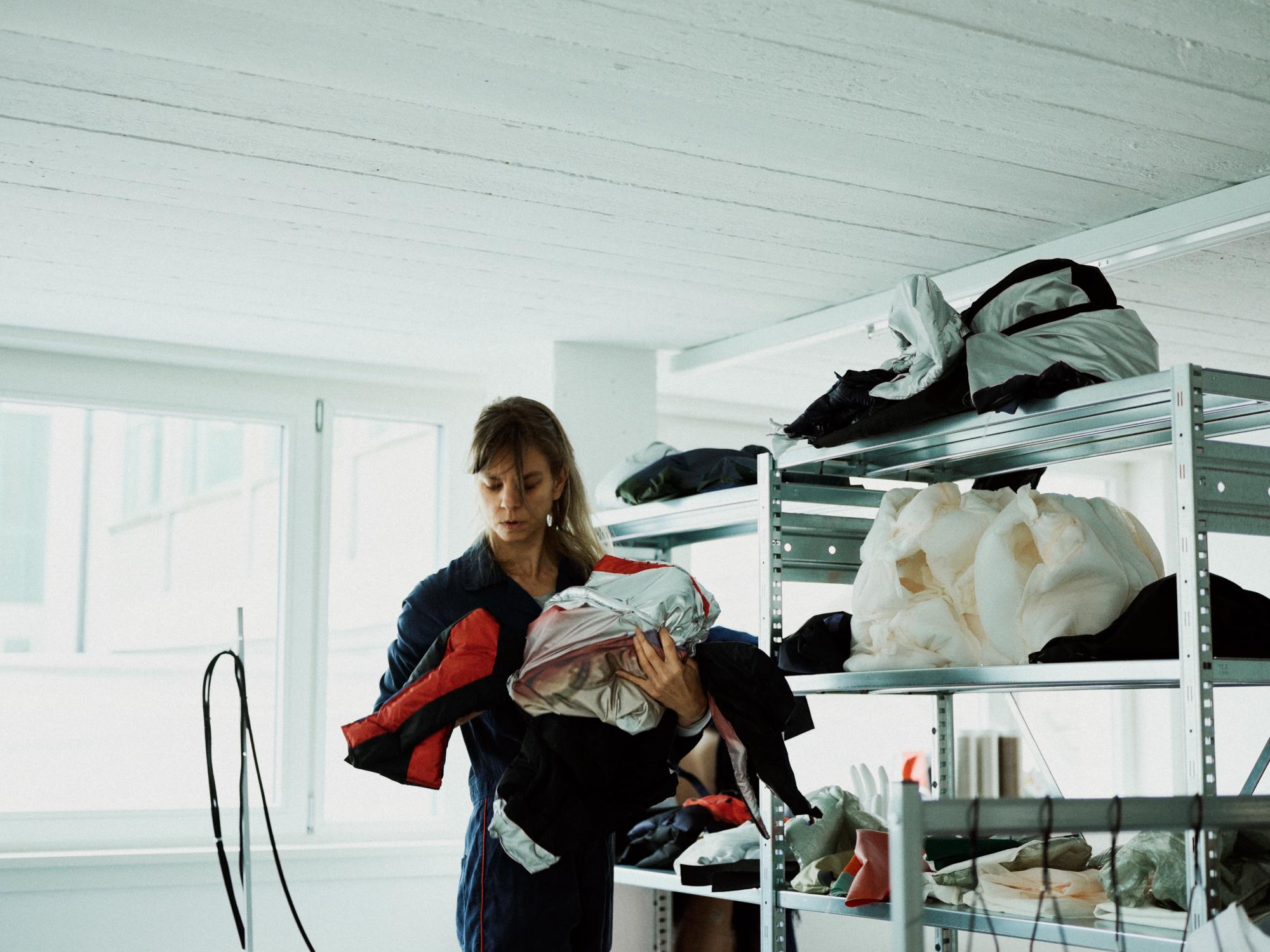 Andrea Winklers Skulpturen aus technischen Textilien und Schutzkleidung lösen eine Mischung aus Faszination und Unbehagen aus, da sie Fragilität und performative Sportlichkeit engführen. Otto Rummukainens Comicfigur «Jossu» begegnet uns verwoben in ein auf einem Bogen der Textildruckerei aufgespanntes Tuch, das auf der Vor- und Rückseite im jeweiligen schwarz-weissen Negativ zu sehen ist.