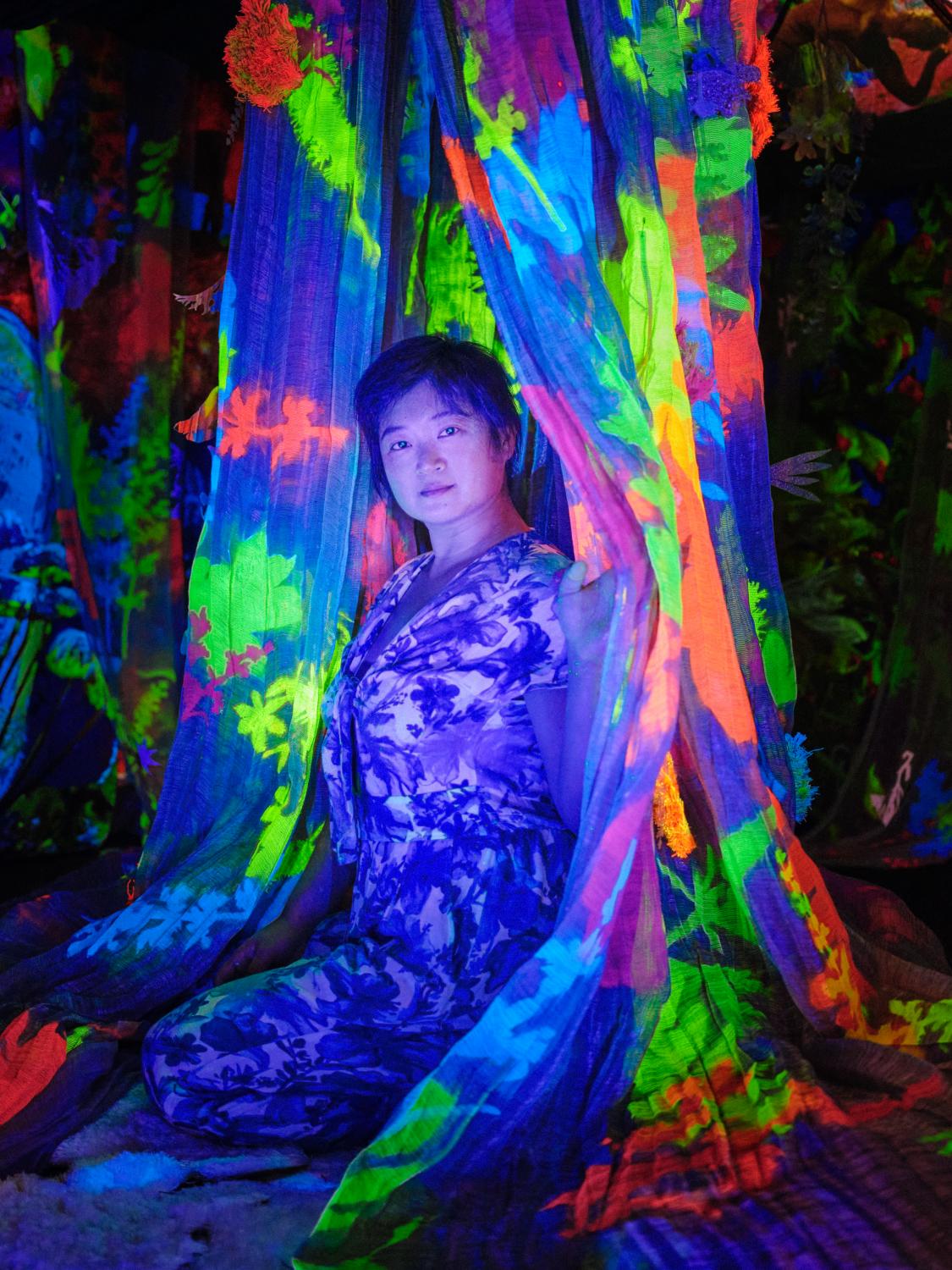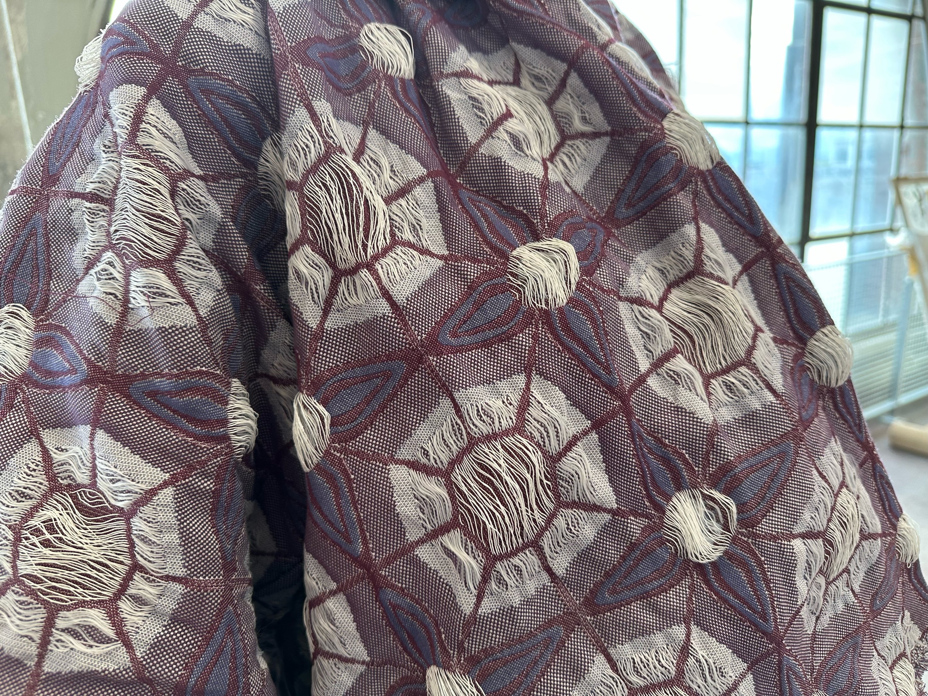 Die Szenografie, die gemeinsam mit «Shadowplay» entwickelt wurde, beschränkt sich bewusst darauf, Materialien aus der Industrie zu verwenden. So entsteht auch auf dieser Ebene ein Zusammenspiel von Kunst und Textilgewerbe.