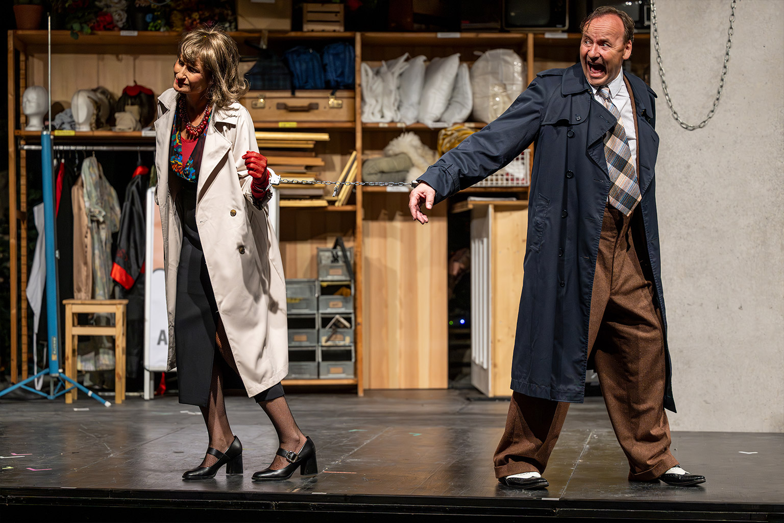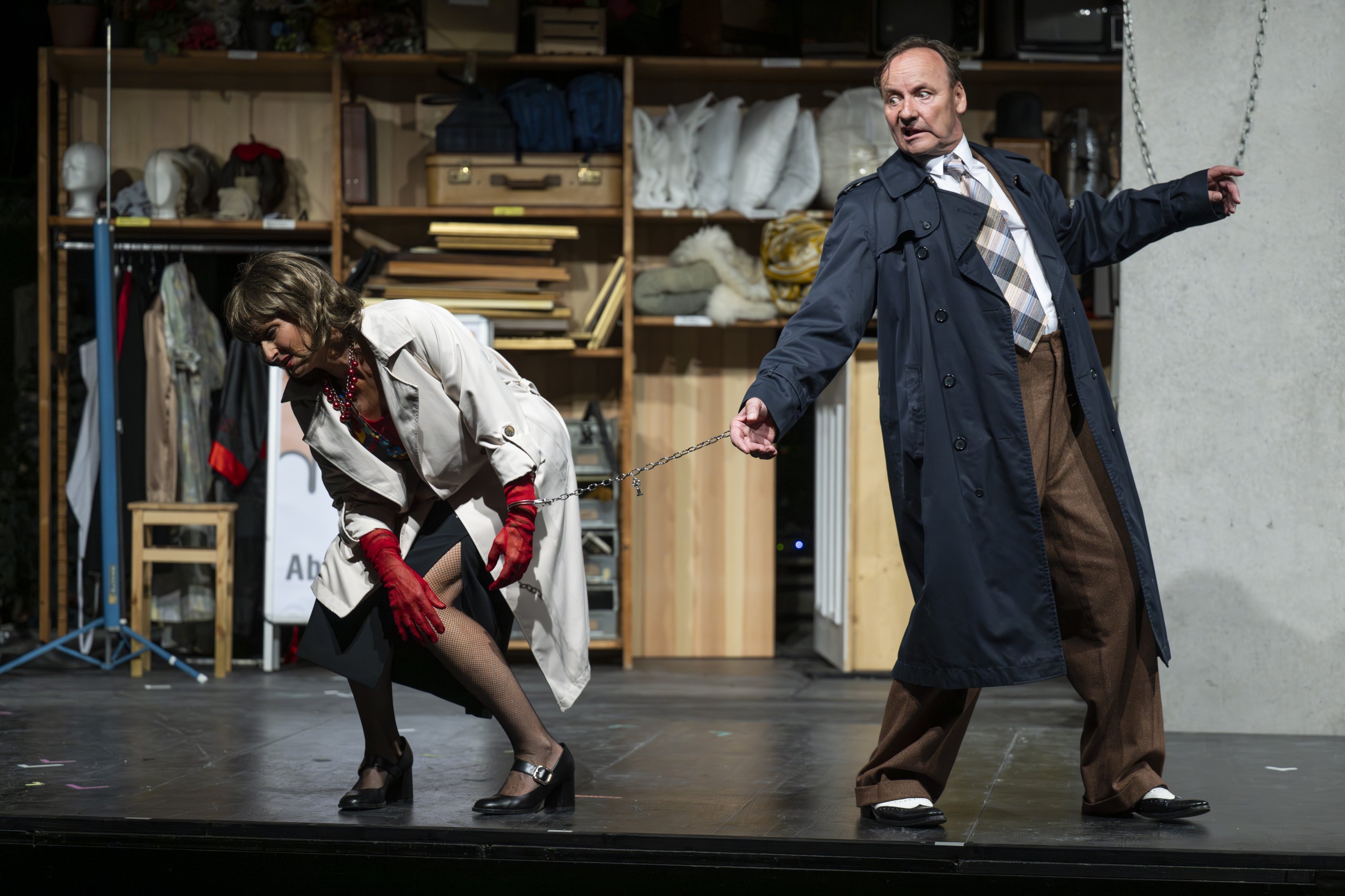 Regisseur Florian Rexer hat dem Stück nämlich eine Rahmenhandlung verpasst. In einem Requisitenlager stossen vier Personen auf das Script zum Stück, und schon beginnen sie unter Ausnutzung des vorhandenen Fundus zu spielen (Bühne von Peter Affentranger). Damit ist dem skurrilen Ablauf des Stücks eine Erklärung angefügt. Warum zum Beispiel die Agenten auf der Strasse sich erst auf das Stichwort hin mit der Laterne vor dem Fenster positionieren und wieder abziehen, wenn niemand mehr hinschaut. Das Spiel im Spiel legt nicht nur auf amüsante Weise Mechanismen des Theaters offen, sondern gewährt gelegentlich auch einen entlarvenden Blick auf die Menschen, die sich nicht immer ganz hinter ihren Rollen verbergen können.